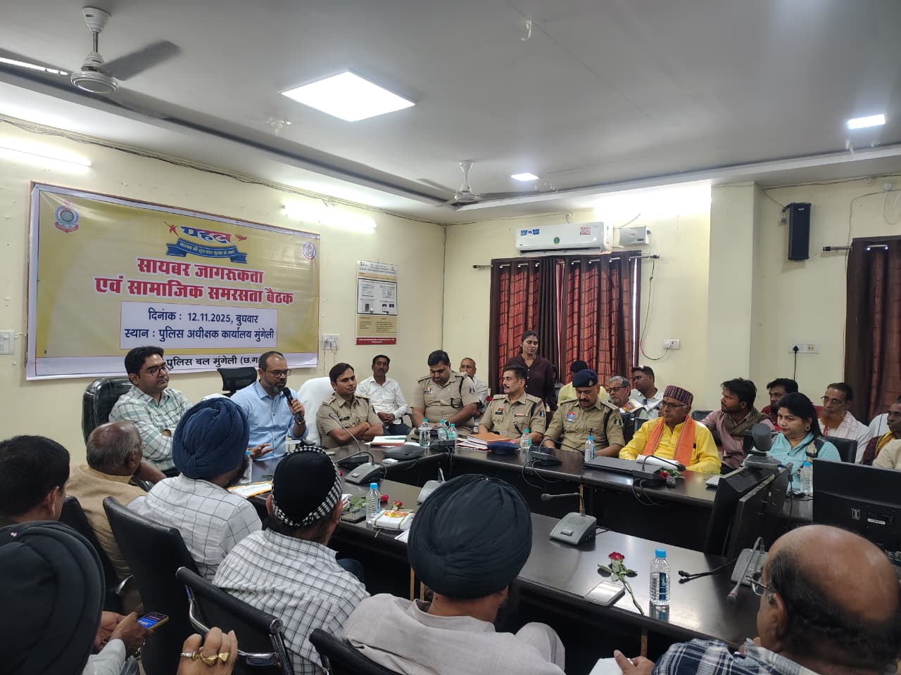 बिलासपुर /मुंगेली/ जिला कलेक्टर कुंदन कुमार की उपस्थिति में पुलिस अधीक्षक भोजराम पटेल के मार्गदर्शन पर पुलिस विभाग द्वारा चलाये जा रहे अभियान पहल के तहत संवाद सभा कक्ष पुलिस अधीक्षक कार्यालय मुंगेली में सामाजिक समरसता बनाये रखने के लिए सामाजिक जागरूकता बैठक का आयोजन किया गया। बैठक में साइबर अपराध, यातायात नियम के पालन, नशामुक्ति एवं बच्चों व महिलाओं से संबंधित अपराधों के संबंध में जानकारी देते हुये सामाजिक स्तर पर सामाजिक बुराईयां एवं कुरितियां साइबर फ्रॉड के प्रलोभन में नहीं आने, नशा से दूर रहने तथा यातायात नियमों का पालन करने व कम उम्र के बच्चों को वाहन चलाने पर प्रतिबंधित करने के संबंध में बातें बतायी। बैठक में जिले के 150 से अधिक समाज प्रमुख एवं सामाजिक प्रतिनिधि उपस्थित रहे।