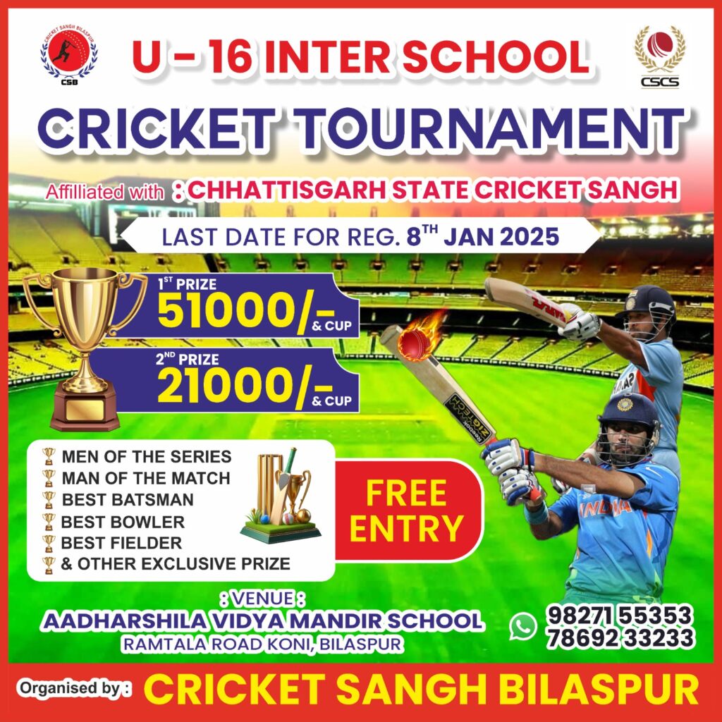 बिलासपुर। क्रिकेट संघ बिलासपुर द्वारा नगर के प्रतिभावान खिलाड़ियों को प्रोत्साहन देने हेतु एवं क्रिकेट के क्षेत्र में नई प्रतिभाओं को तलाश करने के उद्देश्य से अंडर 16 जिला स्तरीय अंतर शालेय ड्यूज बाल क्रिकेट प्रतियोगिता का आयोजन आधारशीला विद्या मंदिर कोनी में किया जाएगा। जिसका उद्घाटन संभवतः 12 जनवरी दिन रविवार से किया जाना है ।यह क्रिकेट प्रतियोगिता छत्तीसगढ़ क्रिकेट संघ के निर्देश पर नई प्रतिभाओं को खोजने के उद्देश्य से की जा रही है। जिसमें शासकीय /अशासकीय विद्यालय के टीम निशुल्क भाग ले सकती हैं। प्रविष्टि हेतु अंतिम तिथि 8 जनवरी रखी गई है। जिला स्तरीय अंतर शालेय क्रिकेट प्रतियोगिता में विजेता टीम को 51000 का नगद राशि तथा उपविजेता टीम को 21000 रुपए की राशि एवं कप ईनाम के रूप में दिया जाएगा साथी प्रत्येक मैच में मैन ऑफ द मैच, मैन ऑफ द सीरीज, बेस्ट बॉलर, बेस्ट बेस्टमैन,बेस्ट फील्डर, इत्यादि अन्य आकर्षक पुरस्कार दिए जाएंगे। अब तक डी ए वी पब्लिक स्कूल, दिल्ली पब्लिक स्कूल, कैरियर प्वाइंट वर्ल्ड स्कूल , छत्तीसगढ़ स्कूल, करनाल अकादमी ऑफ रेडियंट एजुकेशन, बर्जेश इंग्लिश मीडियम स्कूल, केंद्रीय विद्यालय रेलवे, सेंट विंसेंट पेलोटी स्कूल मंगला , आधारशीला विद्या मंदिर स्कूल , आत्मानंद लाला लाजपत राय स्कूल खपरगंज , कृष्ण पब्लिक स्कूल कोनी और सेंट जेवियर स्कूल सरकंडा ने भाग ले चुकी है और भाग लेने के इच्छुक विद्यालय पात्रता प्रमाण पत्र के साथ , प्राचार्य के द्वारा हस्ताक्षरित खिलाड़ियों की सूची क्रिकेट का संघ बिलासपुर के कार्यालय में 8 जनवरी जमा कर अपनी टीम की प्रविष्टि करा सकते है । इंटर स्कूल मे भाग लेने के लिए दसवीं कक्षा तक के ही खिलाड़ी खेल सकते है। और अधिक जानकारी के लिए क्रिकेट संघ बिलासपुर के सचिव विंटेश अग्रवाल से संपर्क कर सकते है मोबाइल नंबर 9827155353 में कर सकते हैं।