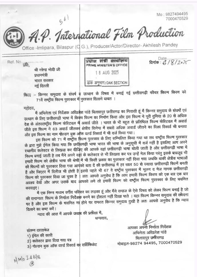 बिलासपुर। एक कलाकार जब अपने जुनून पर आता है तब वह इतिहास बदल कर रख देता है राष्ट्रीय फिल्म अवार्ड का इतिहास 71 साल पुराना है और इस दौरान इस अवार्ड में सिर्फ भारतीय भाषा की अनुसूची में दर्ज भाषाओं को ही राष्ट्रीय अवार्ड दिया जाता है परंतु अखिलेश ने अपनी छत्तीसगढ़ी भाषा में बनी फिल्म किरण को राष्ट्रीय अवार्ड में सम्मिलित किया था परंतु छत्तीसगढ़ी भाषा का आठवीं अनुसूची में दर्ज न होने की वजह से उनकी फिल्म को राष्ट्रीय अवार्ड नहीं मिला तब अखिलेश ने प्रधानमंत्री नरेंद्र मोदी को चिट्ठी लिखी और बताया कि उनकी फिल्म ने पूरी दुनिया में 63 से ज्यादा अवार्ड जीते हैं