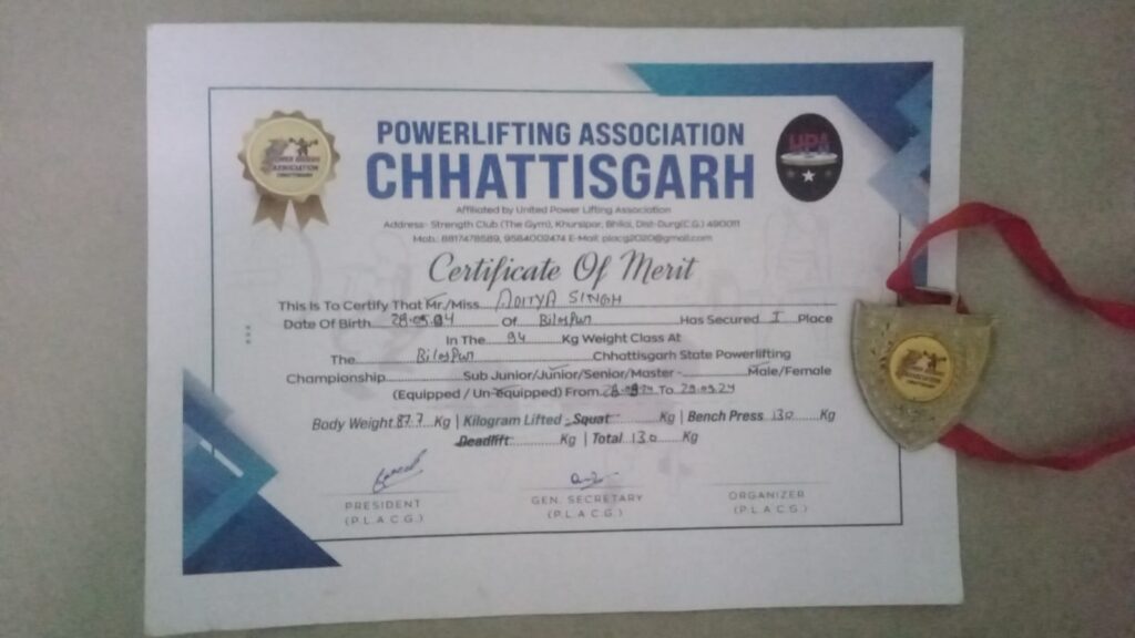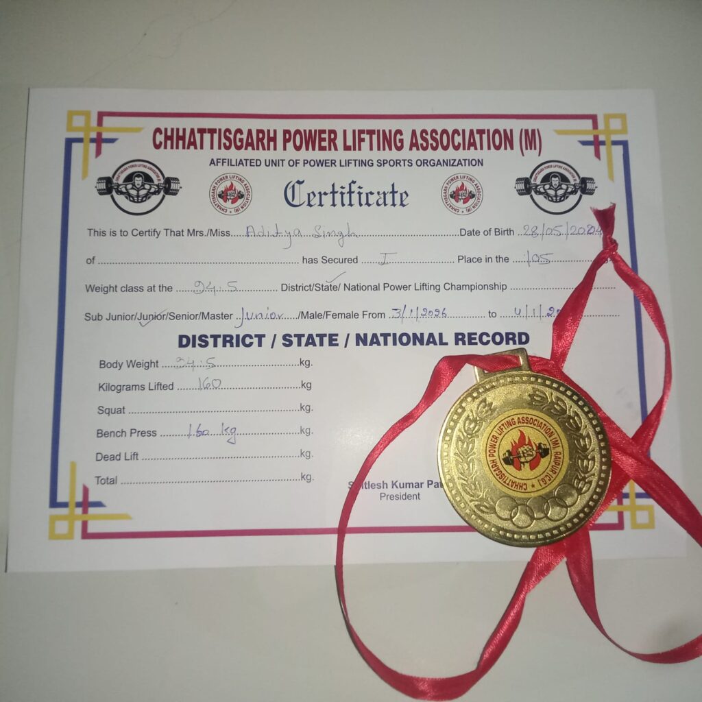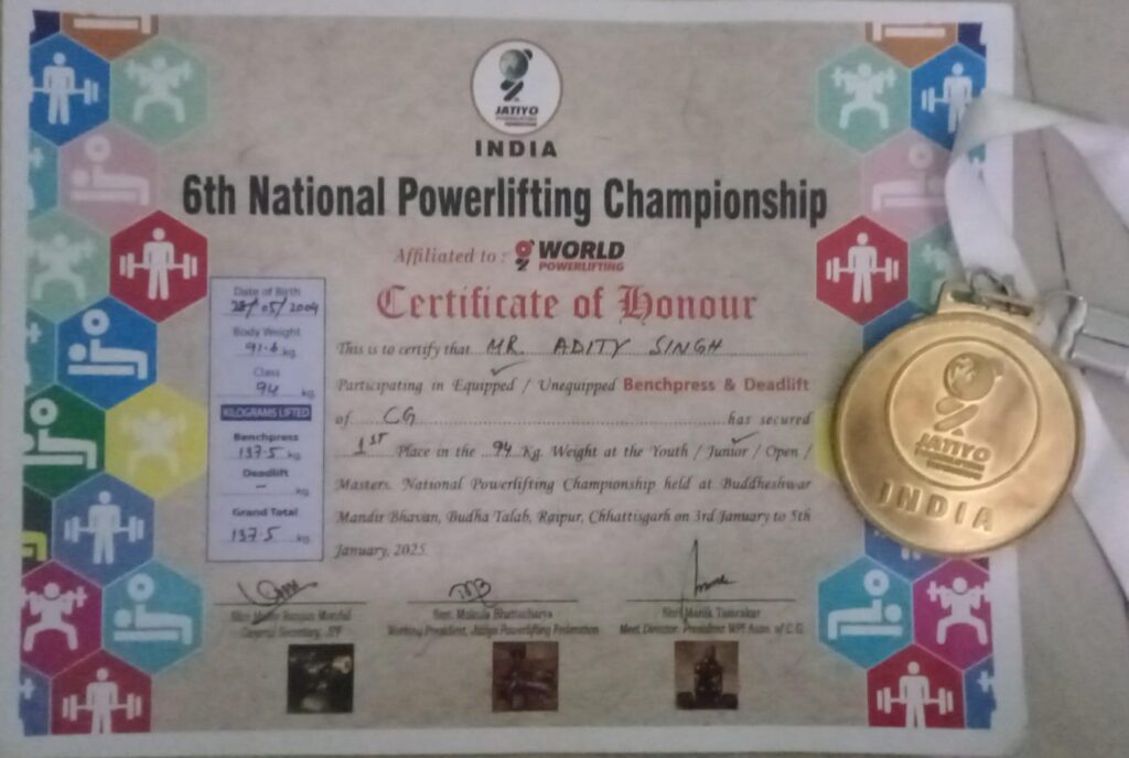 आदित्य ने 160 KG भार उठाकर जीता गोल्डमेडल….राज्य मे प्रथम जीत दर्ज कर जूनियर मे रिकॉर्ड बनाया….पावर लिफ्टिंग चैंपियनशिप प्रतियोगिता में मारी बाजी