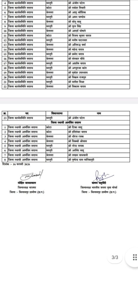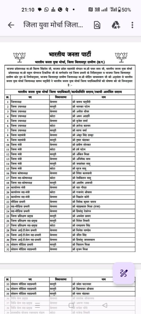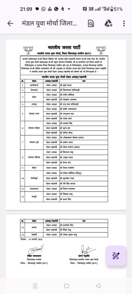 बिलासपुर ग्रामीण में युवामोर्चा के जिला और मण्ड़ल पदाधिकारियों की घोषणा