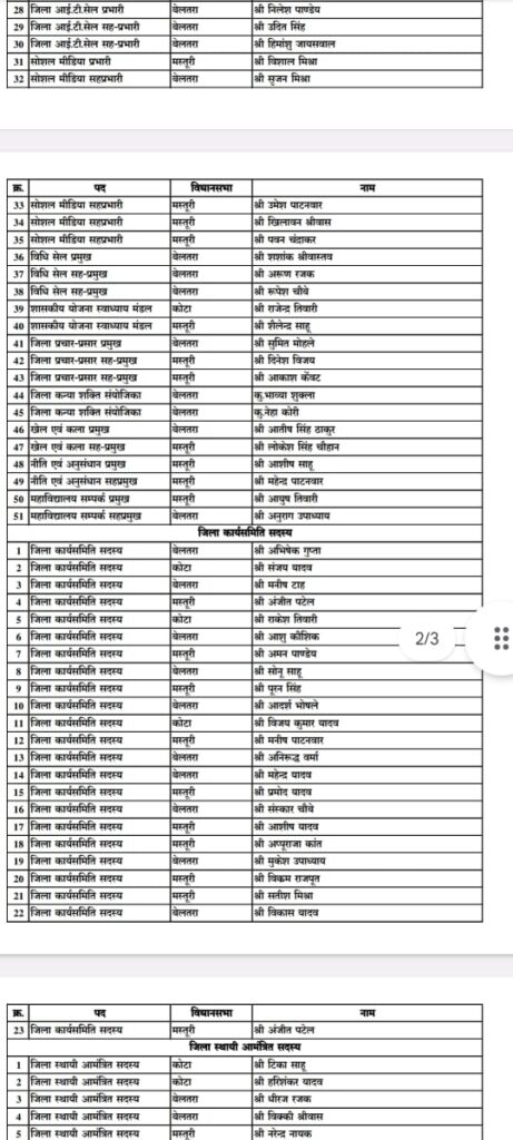 युवामोर्चा के इस जम्बो टीम में 51 पदाधिकारी,23 कार्यसमिति सदस्य सहित 8 विशेष आमंत्रित सदस्यों के नाम शामिल किए गए हैं इसी तरह से ग्रामीण जिला के चौदह मण्डल के अध्यक्ष व महामंत्री के नाम की घोषणा की है संगठन में युवामोर्चा को भाजपा मुख्य संगठन की रीढ़ के रूप में देखा जाता है यही कारण है कि इसकी घोषणा को लेकर कार्यकर्ताओं में भारी उत्सुकता थी ।