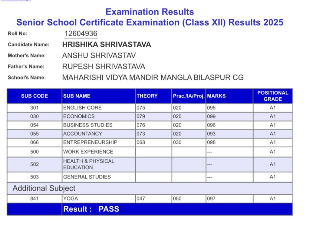 विलासपुर।महर्षि विद्या मंदिर में पढ़ने वाली छात्रा ऋषिका श्रीवास्तव के कक्षा 12 वीं में *97%* के साथ न सिर्फ स्कूल का नाम रोशन किया है बल्कि अपने माता पिता के साथ ही स्कूल के गुरुजनों का भी नाम रोशन किया है।