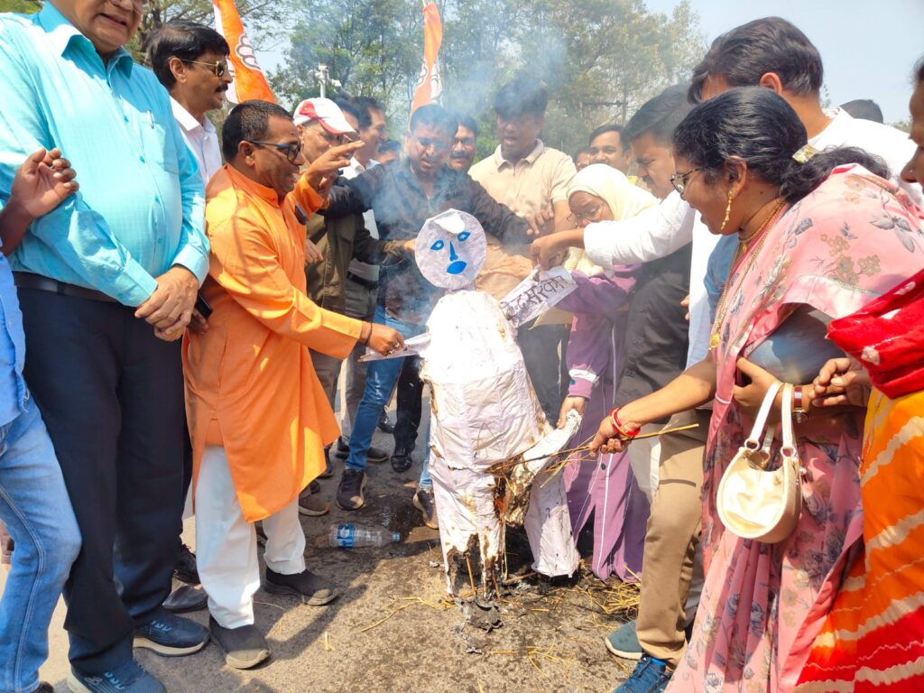 पुतले को जलाकर चीथड़े तो कर दिए और लातों से भी मारा गया