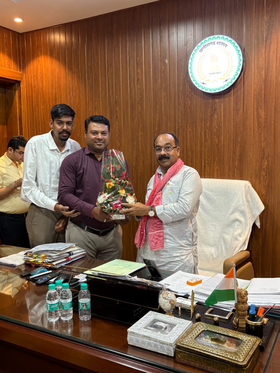 बिलासपुर। छत्तीसगढ़ आपक्स के प्रदेश महामंत्री मुकेश पुरी गोस्वामी ने 3% बढ़ोतरी का स्वागत किया। और उपमुख्यमंत्री अरुण साव से मुलाकात कर उन्हें बधाई दी, आभार व्यक्त किया। आज छत्तीसगढ़ का बजट मुख्यमंत्री विष्णु देव साव के सुशासन में छत्तीसगढ़ के विकास को गति प्रदान करेगा। सरकार का बजट वित्त मंत्री ओपी चौधरी द्वारा पेश किया गया, जिसमें छत्तीसगढ़ सरकार के शासकीय कर्मचारियों का 3% DA बढ़ाया गया। अब 53% DA मिलेगा, महंगाई से राहत मिलेगी, जिससे शासकीय कर्मचारियों और अधिकारियों ने खुशी जाहिर की। छत्तीसगढ़ की सरकार कर्मचारी हितैषी है। संयोजक कमल वर्मा, प्रदेश अध्यक्ष आपक्स सत्येंद्र देवगन, मुकेश पुरी गोस्वामी, प्रदेश महामंत्री अपेक्स एवं समस्त कर्मचारियों ने उन्हें बधाई दी।