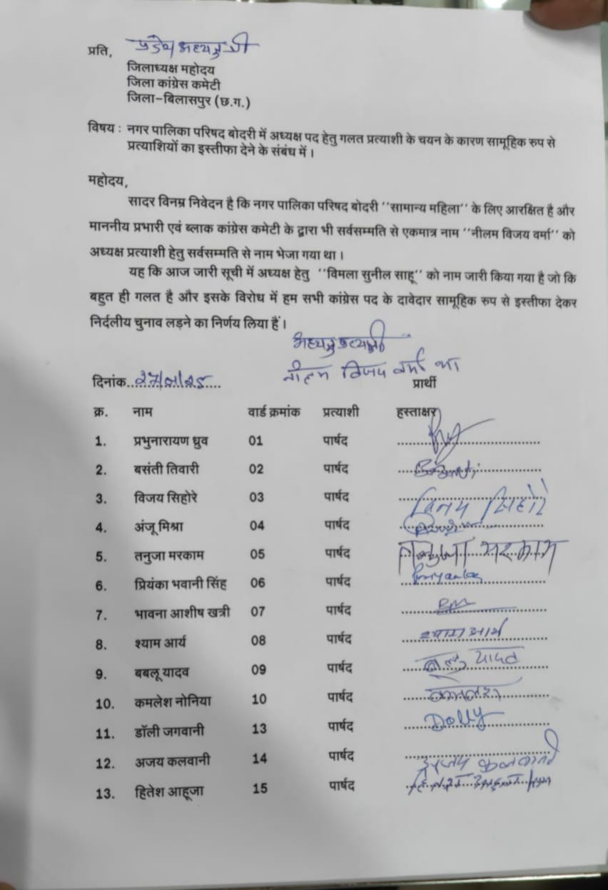 बिलासपुर- नगरीय निकाय चुनाव के लिए टिकट वितरण के बाद कांग्रेस पार्टी में घमासान मचा हुआ है, नगर पालिका बोदरी में अध्यक्ष पद की उम्मीदवारी को लेकर कांग्रेस के पार्षद प्रत्याशियों ने मोर्चा खोल दिया है वहीं नीलम विजय वर्मा को टिकट न मिलने की वजह से अब 15 में से 13 पार्षद प्रत्याशी इस्तीफा देने के लिए अड़ गए हैं.. विश्वसनीय सूत्रों से मिली जानकारी के अनुसार बोदरी नगर पालिका के लिए कांग्रेस ने सुनीता सुनील साहू को अध्यक्ष पद की प्रत्याशी बनाया था लेकिन नीलम विजय वर्मा को अध्यक्ष पद का प्रत्याशी चयनित करने को लेकर अड़ गए हैं.. जानकारी के मुताबिक नगर पालिका बोदरी के वार्ड क्रमांक 11 और 12 के प्रत्याशियों को छोड़कर सभी प्रत्याशी नगर पालिका अध्यक्ष पद के लिए आर पार की लड़ाई के मूड में नजर आ रहे हैं.. बोदरी नगर पालिका के अंतर्गत कुल 15 वर्ड आते हैं, ऐसे में लंबे समय से बोदरी में कांग्रेस पार्टी का दबदबा रहा है, लेकिन सुनीता सुनील साहू की दावेदारी को लेकर कांग्रेस के पार्षद प्रत्याशी खासे नाराज नजर आ रहे हैं, और अब अध्यक्ष पद के प्रत्याशी के लिए पार्षद पद के प्रत्याशियों ने मोर्चा खोल दिया है..
