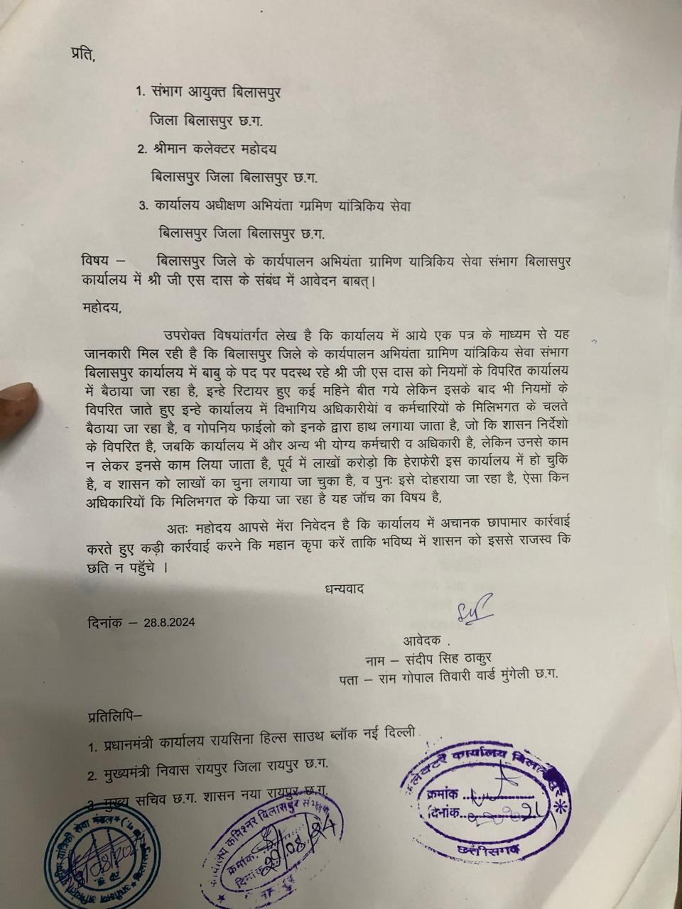 कार्यपालन अभियंता ग्रामीण यांत्रिकी सेवा संभाग कार्यालय में पदस्थ GS दास की हुई कमिश्नर ,कलेक्टर व SE से शिकायत…रिटायर्ड होने के बाद भी नियम विरुद्ध है पदस्थ,,,