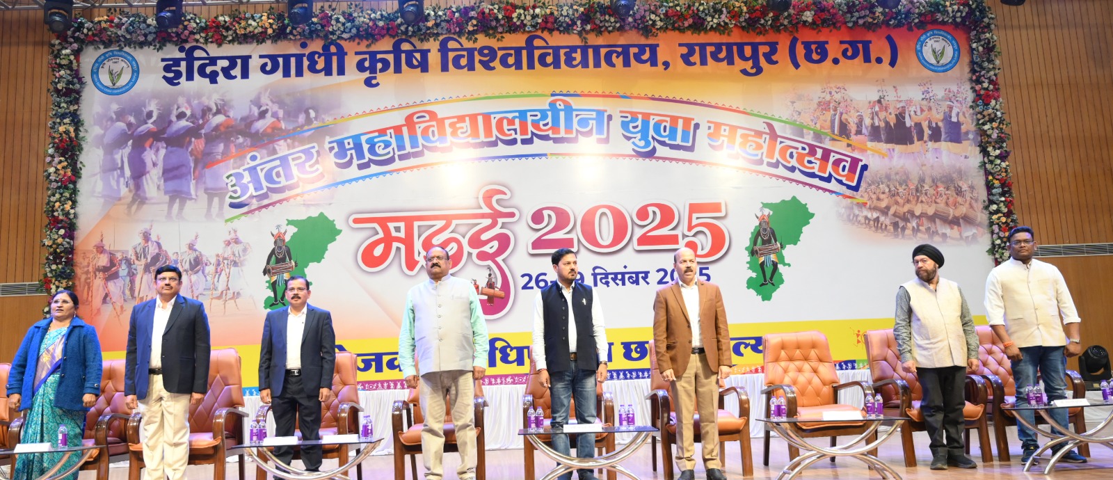 रायपुर 26 दिसम्बर 2025। इंदिरा गांधी कृषि विश्वविद्यालय रायपुर में 26 से 29 दिसम्बर 2025 तक आयोजित चार दिवसीय 31वें अंतर महाविद्यालयीन युवा महोत्सव ‘‘मड़ई-2025’ का शुभारंभ 31 महाविद्यालयों के लगभग 900 विद्यार्थियों द्वारा सहभागिता से हुआ। कृषक सभागार में आयोजित मड़ई 2025 की शुरूआत भव्य सांस्कृतिक शोभायात्रा से हुई जिसमें 31 कृषि महाविद्यालयों के विद्यार्थियों ने अपने-अपने जिलों की लोक संस्कृति, लोक पर्व, स्थानीय रीति-रिवाज, तथा अन्य विशेषताओं को प्रदर्शित किया।