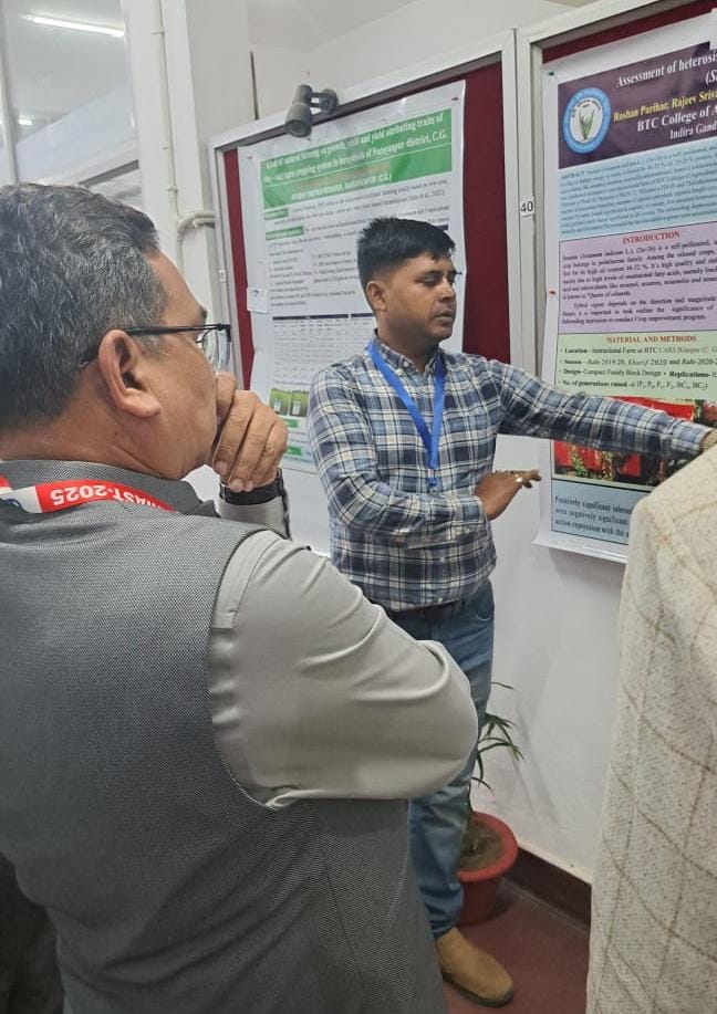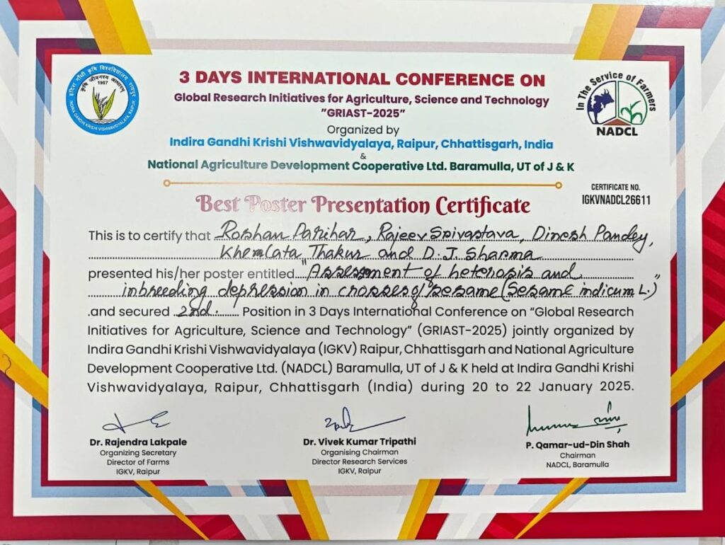 बिलासपुर – इंदिरा गांधी कृषि विश्वविद्यालय के 39वें स्थापना दिवस के अवसर पर इंदिरा गांधी कृषि विश्वविद्यालय, रायपुर एवं राष्ट्रीय कृषि विकास सहकारी लिमिटेड, बरामूला (जम्मू कश्मीर) के संयुक्त तत्वावधान में दिनांक 20 से 22 जनवरी 2025 तक आयोजित “कृषि, विज्ञान और प्रौद्योगिकी के लिए वैश्विक अनुसंधान पहल” विषय पर आयोजित तीन दिवसीय अंतर्राष्ट्रीय सम्मेलन में बैरिस्टर ठाकुर छेदीलाल कृषि महाविद्यालय एवं अनुसंधान केंद्र, बिलासपुर के अनुवांशिकी एवं पादप प्रजनन विज्ञान विषय के वैज्ञानिक डॉ. (ले.) रोशन परिहार को उनके शोध पत्र “तिल की विभिन्न किस्मों के बीच संकरण कराकर संकर ओज और अंतः प्रजनन ह्रास का आंकलन” विषय पर बेस्ट पोस्टर का अवार्ड प्रदान किया गया।