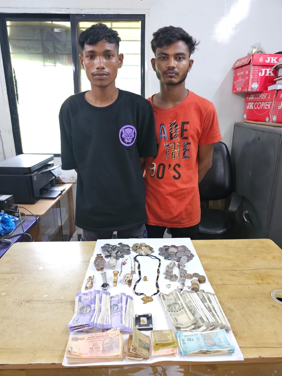 जिस पर आरोपी राज विश्वकर्मा एवं अमरदास कुर्रे उर्फ सूरज को गिरफ्तार कर दोनों के कब्जे से चोरी की सोने चांदी के जेवरात एवं नगदी रकम 25,575/- रूपये जुमला कीमती लगभग 55,000/- रूपये जप्त कर दोनों के विरूद्ध कार्यवाही किया गया। इस मामले में राज विश्वकर्मा पिता उत्तम विश्वकर्मा उम्र 20 साल निवासी नीम डबरी नहरपारा खमतराई थाना खमतराई रायपुर