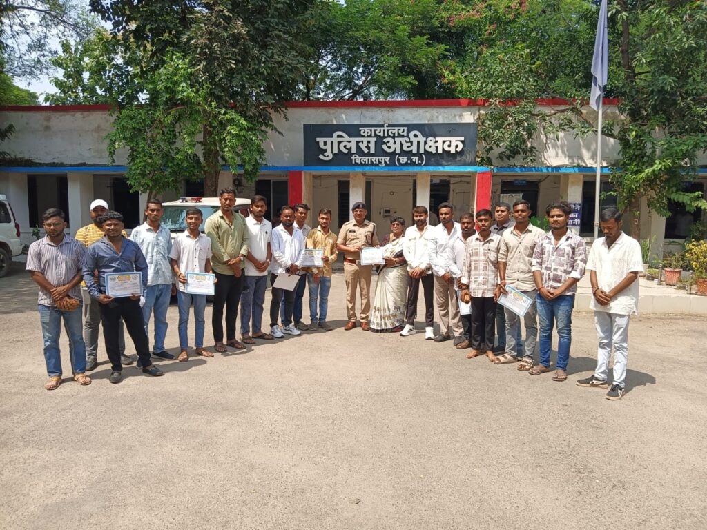को बैठक में दिए गए निर्देश के अनुपालन में गणेश उत्सव पर्व एवं विसर्जन के दौरान यातायात व्यवस्था के सुगम सुरक्षित संचालन में है सराहनीय योगदान के लिए वरिष्ठ पुलिस अधीक्षक बिलासपुर श्री रजनेश सिंह द्वारा पुलिस प्रशासन की ओर से इन सभी चिन्हित गणित समितियों के अध्यक्ष एवं पदाधिकारी को प्रशंसा पत्र एवं श्रीफल भेंट कर सम्मानित किया गया।