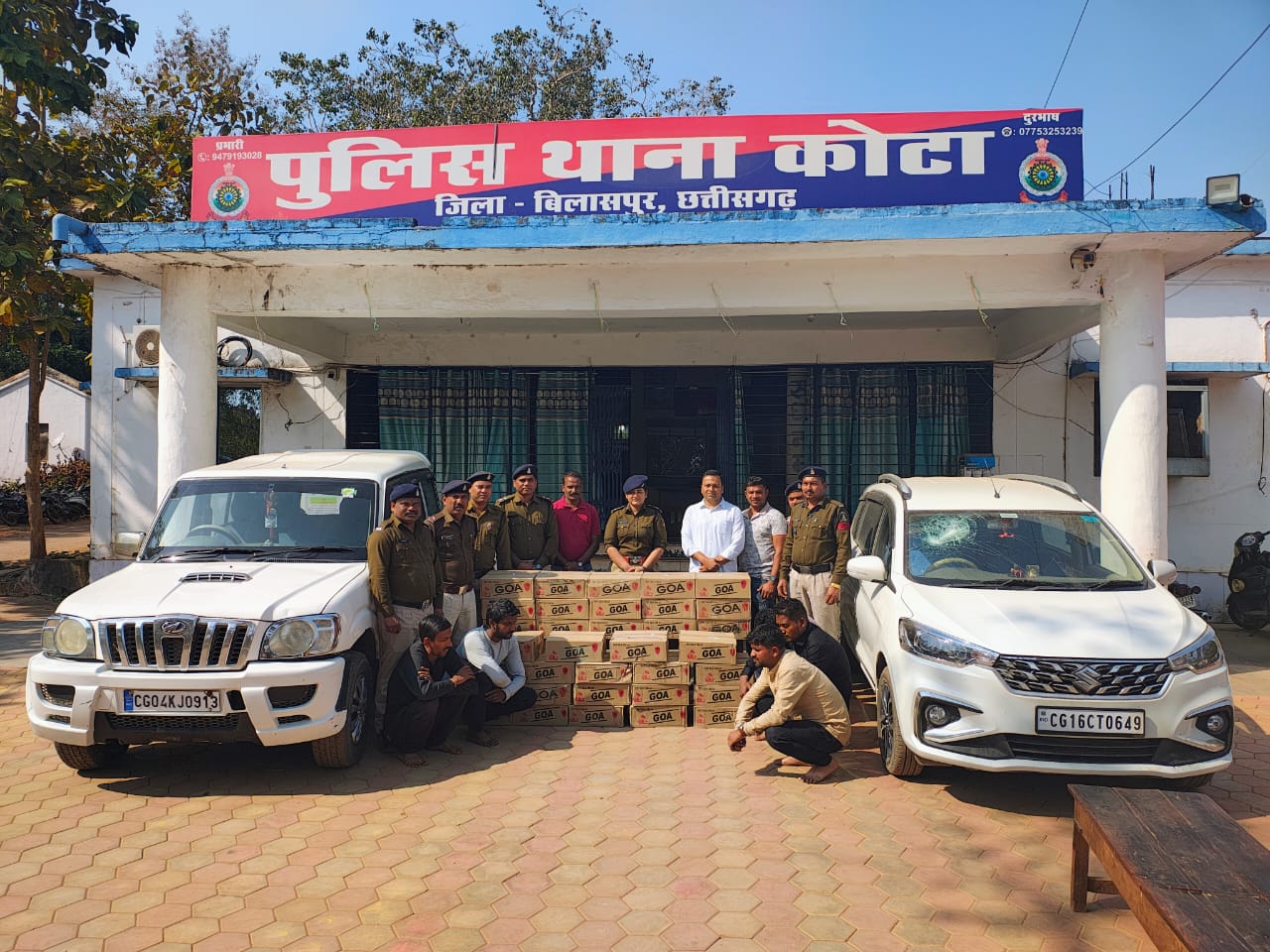 कोटा पुलिस और एसीसीयू की टीम ने मौहारखार क्षेत्र में दो संदिग्ध वाहनों—स्कॉर्पियो (सीजी 04 केजे 0913) और मारुति अर्टिगा (सीजी 16 सीटी 0649)—को रोककर तलाशी ली। कार्रवाई में 18 और 16 पेटी गोवा व्हिस्की बरामद हुई, जो मध्य प्रदेश के भालूमाड़ा से तस्करी कर लाई जा रही थी। शराब का अनुमानित बाजार मूल्य 2.5 लाख रुपये है। साथ ही, दोनों वाहन और चार मोबाइल फोन जब्त किए गए।