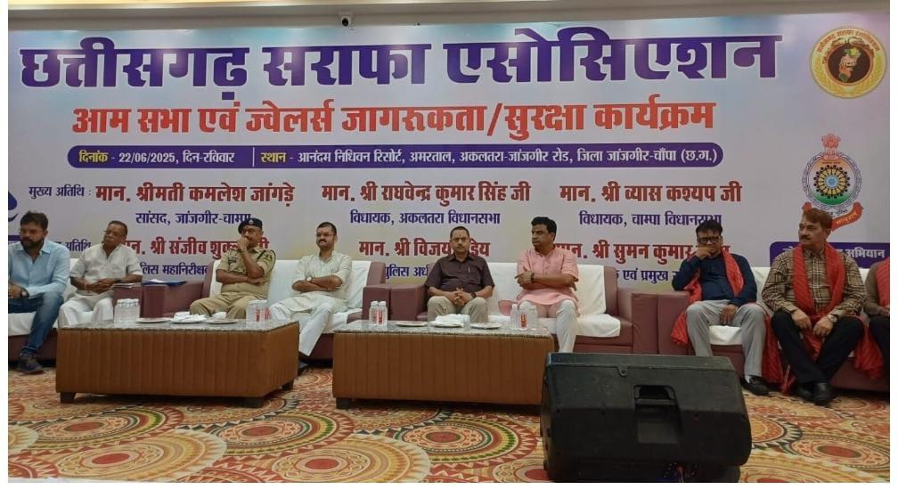बिलासपुर–छत्तीसगढ़ सराफा एसोसिएशन की वार्षिक आमसभा का कार्यक्रम जांजगीर चांपा में आयोजित किया गया।जिसमें मुख्य अतिथि के रूप में जांजगीर-चांपा की महिला सांसद कमलेश जांगड़े ,अकलतरा विधायक राघवेंद्र कुमार सिंह, चांपा के विधायक व्यास कश्यप पुलिस अधीक्षक विजय पांडे एवं बीआईएस के वैज्ञानिक की निदेशक एवं प्रमुख सुमन कुमार गुप्ता , छत्तीसगढ़ सराफा एसोसिएशन के अध्यक्ष कमल सोनी मौजूद थे । वार्षिक आमसभा में प्रदेश शासन के गृहमंत्री विजय शर्मा के मार्गदर्शन में 100 संगठन के 500 से अधिक सदस्यों की भागीदारी रही। जिसमें जागरूकता एवं सुरक्षा कार्यक्रम को लेकर को लेकर विचार मंथन कियागया। सराफा एसोसिएशन की वार्षिक आम सभा में पुलिस महानिरीक्षक संजीव शुक्ला का भी जागरूकता संदेश का वाचन किया गया।
