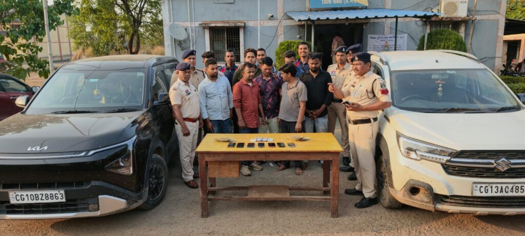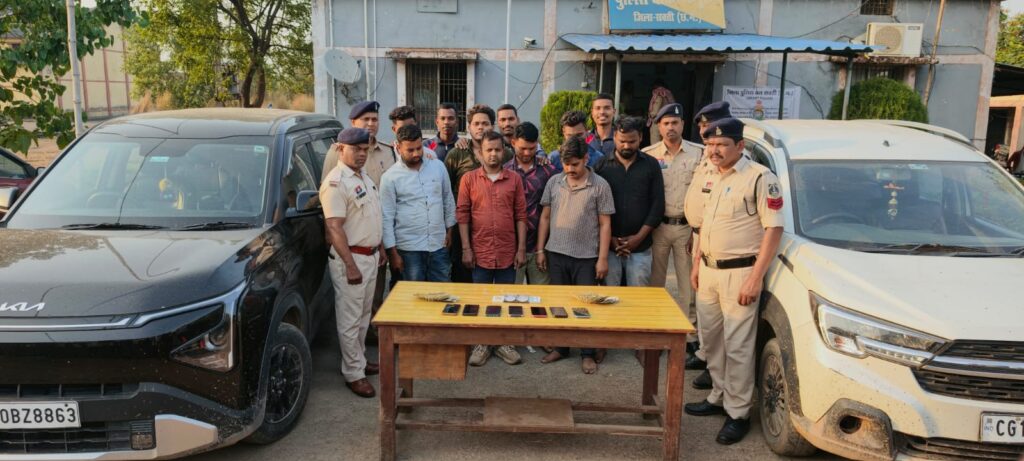 इस बीच आम जगह पर कुछ जुआरी जुआ खेलने सूचना कन्फर्म हुई। पुलिस चौकी फगुरम, साईबर सेल सक्ती, एवं नव आरक्षक की टीम के द्वारा दबिस देने पर आठ जुआरी दीपक कुमार साहु पिता झाडुराम साहु उम्र 24 वर्ष सा. मिरचीद थाना बिलाईगढ़,शिवम साहु पिता बीरबल साहु उम्र 26 वर्ष सा. नगरदा थाना बिलाईगढ, संजय साहु पिता नंदराम साहु उम्र 22 वर्ष सा. देवरहा थाना बिलाईगढ़ तीनो जिला सारंगढ़ बिलाईगढ़ , भेषज किशोर साहु पिता बुधराम साहु उम्र 33 वर्ष सा. पोरथा वार्ड क. 10 थाना सक्ती जिला सक्ती, देवेन्द्र साहु पिता रेवती लाल साहु उम्र 26 वर्ष सा चांटीपाली थाना डभरा जिला सक्ती. विरेन्द्र कुरे पिता रामलाल कुर्रे उम्र 29 वर्ष सा. लवसरा थाना बाराद्वार जिला सक्ती. राकेश कुमार सान्डे पिता धनाराम सान्डे उम्र 30 वर्ष सा. झालरौन्दा थाना बाराद्वार जिला सक्ती और दीपक कुमार चन्द्रा पिता रामेश्वर चन्द्रा उम्र 32 वर्ष सा झालरौन्दा थाना बाराद्वार जिला सक्ती मौके पर 52 पत्ती तास से काटपत्ती नामक जुआ खेलते मिले जिनके फड़ व पास से नगदी रकम कुल 26,000 रू. एवं 07 नग मोबाईल कीमति 01 लाख रूपये एवं घटनास्थल के पास संदिग्ध लावारिस स्थिति मे दो 15-15 लाख की कीमति दो कार मिलने से जुआड़िआन के विरुद्ध धारा 3(2) छ.ग. जुआ प्रतिषेध अधिनियम 2022 के तहत कार्यवाही किया गया है