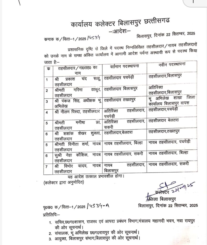 बिलासपुर। बिलासपुर जिले में तहसीलदारों के कार्यभार में कलेक्टर संजय अग्रवाल ने बदलाव किया है। बदलाव में सात तहसीलदार और नायब तहसीलदार प्रभावित हुए हैं। पचपेड़ी के तहसीलदार प्रकाश चंद्र साहू को बिलासपुर का मुख्य तहसीलदार बनाया गया है जबकि बिलासपुर की तहसीलदार गरिमा ठाकुर को अतिरिक्त तहसीलदार बिलासपुर बनाया गया है। इसके अलावा पंकज सिंह भू अभिलेख अधीक्षक से तखतपुर तहसीलदार का प्रभार वापस लेते हुए उन्हें वापस भू अभिलेख शाखा जिला बिलासपुर बुलाया गया है। बिलासपुर के नायब तहसीलदार विभोर यादव को नायब तहसीलदार सकरी बनाया गया है। वही नायब तहसीलदार सकरी नेहा कौशिक को नायब तहसीलदार बिल्हा बनाया गया है।