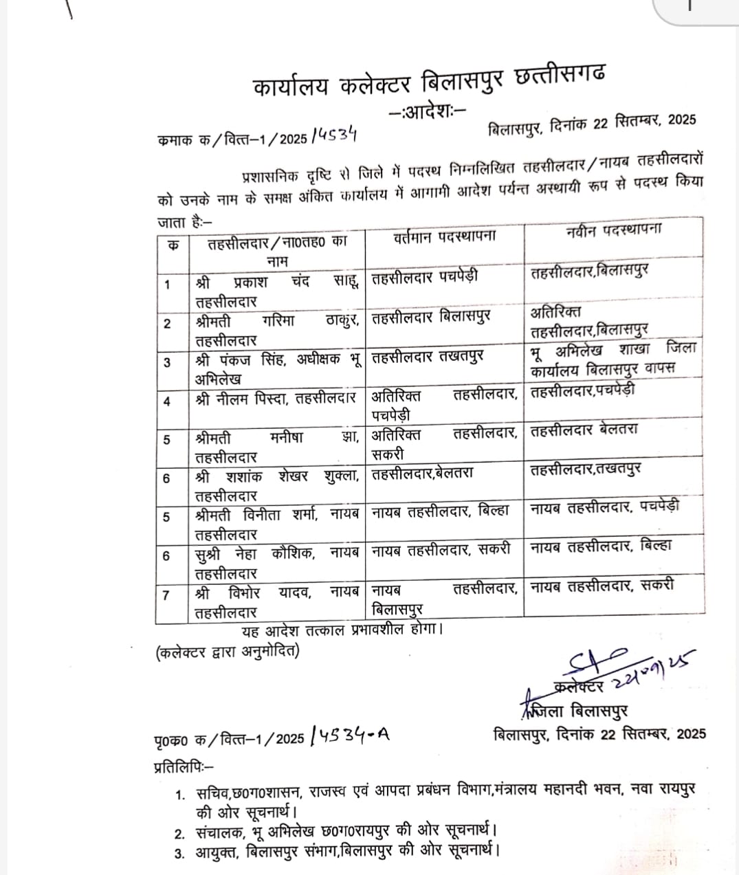 बिलासपुर कलेक्टर संजय अग्रवाल ने तहसीलदारों,नायब तहसीलदारों और राज्य प्रशासनिक सेवा के अफसरों के बीच कार्य आबंटन किया है।