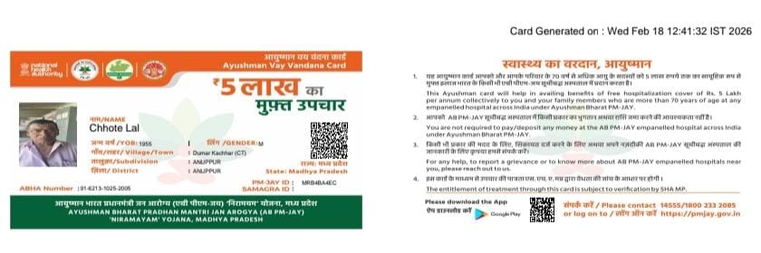 सहित कई समस्याओं के साथ दो समस्याएं बुजुर्गों की भी आयी कि उनका आयुष्मान कार्ड नहीं बना है,जिससे उनको इस योजना का लाभ नहीं मिल पा रहा है, मॉर्निंग वॉक से लौटने के तुरंत बाद कार्यालय के स्टाफ को हितग्राहियों के घर भेज कर 3 से 4 घंटे के अंदर ही 70 वर्ष से ऊपर के बुजुर्गों का आयुष्मान कार्ड बनवाकर उन बुजुर्गों को सौंपा गया।
