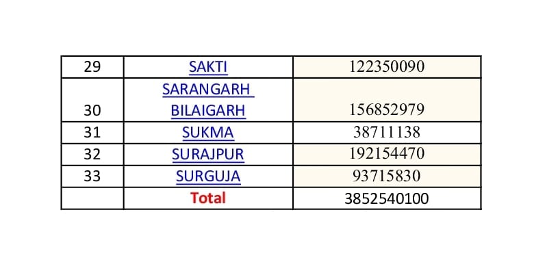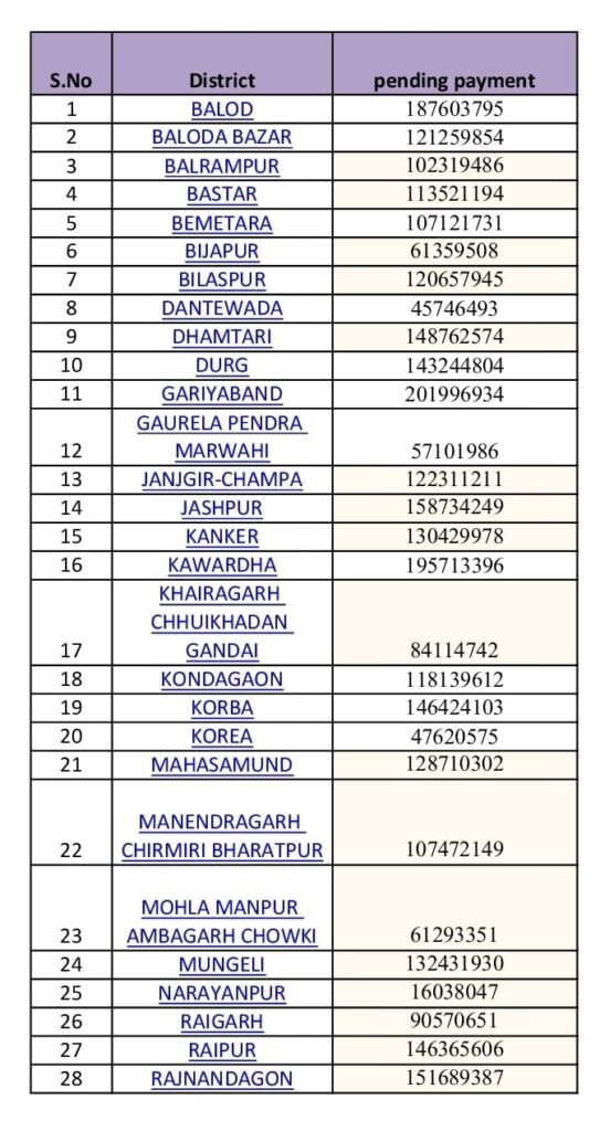 बिलासपुर…सरकारी आंकड़ों से मिली जानकारी के अनुसार प्रदेश के 33 जिलों में मनरेगा मजदूरों को 385 करोड़ 25 लाख 40 हजार 100 रुपयों का भुगतान किया जाना बाकी है। जानकारी देते चले की मजदूरों को दिया जाने वाला करोड़ो का लंबा चौड़ा भुगतान पिछले 5 महीनो से लंबित है। मजदूर अधिकारियों के चक्कर काटने को मजबूर है। मामले को लेकर जिला पंचायत सभापति अंकित गौरहा ने आंदोलन का ऐलान किया है।