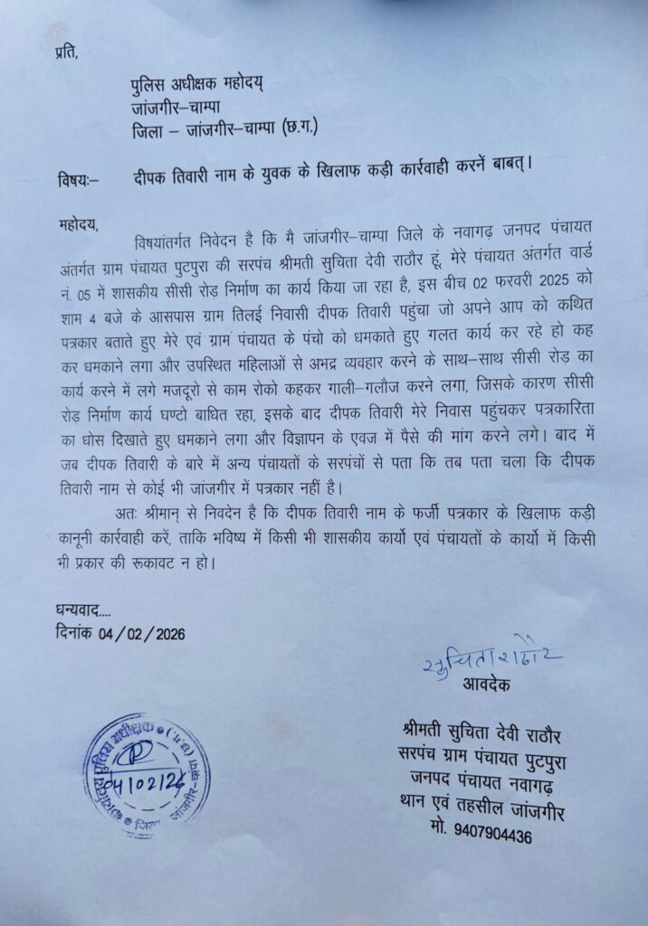 जांजगीर-चाम्पा। जिले में पत्रकारिता की आड़ में वसूली और दबंगई करने वालों का एक और मामला सामने आया है। नवागढ़ जनपद पंचायत अंतर्गत ग्राम पंचायत पुटपुरा में एक युवक द्वारा खुद को पत्रकार बताकर शासकीय निर्माण कार्य रुकवाने, पंचायत प्रतिनिधियों को धमकाने और पैसों की मांग करने का सनसनीखेज आरोप लगा है। ग्राम पंचायत पुटपुरा की सरपंच सुचिता देवी राठौर ने पुलिस अधीक्षक जांजगीर-चाम्पा को लिखित शिकायत देकर बताया कि 2 फरवरी 2025 को उनके पंचायत क्षेत्र के वार्ड क्रमांक 05 में सीसी रोड निर्माण का कार्य चल रहा था। इसी दौरान ग्राम तिलई निवासी दीपक तिवारी नामक युवक मौके पर पहुंचा और स्वयं को पत्रकार बताते हुए पंचायत प्रतिनिधियों पर दबाव बनाने लगा। शिकायत के मुताबिक युवक ने खुलेआम धमकी दी, मजदूरों को काम बंद करने के लिए उकसाया और मौके पर मौजूद महिलाओं से अभद्र व्यवहार किया।