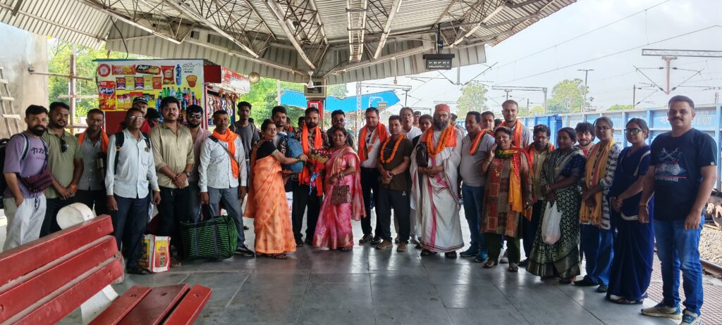 संत स्वामी कृष्ण प्रपन्नाचार्य जी, यशपाल साहू, प्रांत प्रशिक्षण प्रमुख, और अन्य प्रमुख यात्री उमेश पटेल, कैलाश सिन्हा, गजेंद्र जी, ज़िला संयोजक सागर पटेल,बृजेश सोनी जी,शिवम साहू,सौरभ गुप्ता,प्रहलाद साहू,अमन शुक्ला,हर्षित नामदेव,प्रकाश पटेल,सहित सभी यात्रियों का स्वागत किया गया।