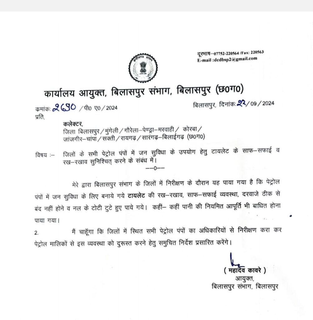 बिलासपुर,/कमिश्नर महादेव कावरे ने पेट्रोल पंपों में आम जनता के उपयोग के लिए बने टॉयलेट की नियमित साफ सफाई और रख रखाव सुनिश्चित करने को कहा है। उन्होंने संभाग के सभी जिला कलेक्टरों को इस आशय का पत्र भी लिखा है। संभागायुक्त ने जारी पत्र में कहा है कि जिलों में भ्रमण और निरीक्षण के दौरान यह पाया गया है कि पेट्रोल पंपों में जन सुविधा के लिए बनाये गये टायलेट की रख-रखाव, साफ-सफाई व्यवस्था, दरवाजे ठीक से बंद नहीं होने व नल के टोटी टुटे हुए पाये गये हैं। कहीं कहीं पानी की नियमित आपूर्ति भी बाधित होना पाया गया। इसलिए जिलों में स्थित सभी पेट्रोल पंपों का अधिकारियों से निरीक्षण करा कर पंप मालिकों से इस व्यवस्था को दुरूस्त करने हेतु समुचित निर्देश प्रसारित करेंगे।