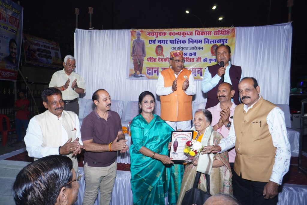 बिलासपुर।14 फरवरी जो कि सर्वस्व दानी प० देवकीनंदन दीक्षित की पुण्य तिथी है इसे स्मृत करते हुये कान्यकुब्ज ब्राम्हण समाज एवं नगर पालिक निगम बिलासपुर के संयुक्त तत्वावधान में दान दाता सम्मान समारोह देवकी नंदन चौक में आयोजित किया गया