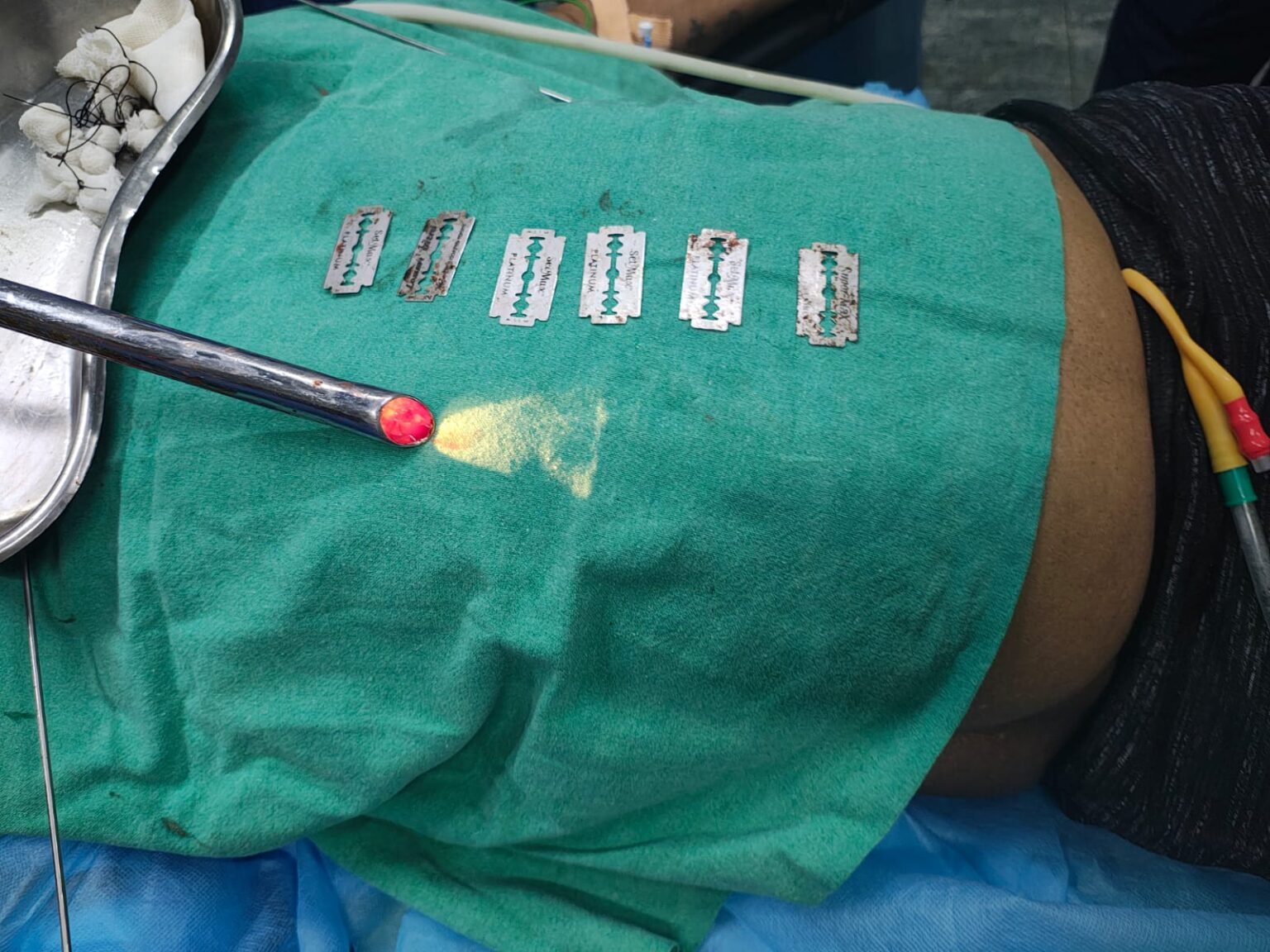 सिम्स के ईएनटी विभाग में पदस्थ डा विद्याभूषण साहू ने बताया कि उसलापुर में रहने वाले केपी मिश्रा(74) को रविवार की सुबह गंभीर स्थिति में अस्पताल लाया गया। उनके मुंह से थूंक के साथ खून निकल रहा था। उन्हें कुछ भी खाने और थूंक निगलने में परेशानी हो रही थी। पूछताछ में कुछ भी बताने के बजाए मरने की बात कह रहे थे। उनकी स्थिति देखते हुए डाक्टरों ने तत्काल ईएनटी के डाक्टरों को इसकी सूचना दी गई। तब डा विद्याभूषण मरीज को देखने पहुंचे। उन्होंने मरीज का एक्स रे कराने कहा। एक्स रे रिपोर्ट में पता चला कि मरीज के गले में सेविंग ब्लेड फंसे हुए हैं। उन्होंने ईएनटी के एचओडी डा आरती पांडेय को इसकी जानकारी देकर आपरेशन की तैयारी के निर्देश दिए। साथ ही इसकी सूचना एनेस्थिया विभाग की प्रमुख डा मधुमिता मूर्ति को दी गई। आपरेशन थिएटर में डा आरती पांडेय, डा विद्याभूषण साहू, डा दीपांजली, डा महादेव बारसे, डा शीतल और डा मधुमिता मूर्ति की टीम ने मरीज का आपरेशन शुरू किया। करीब दो घंटे तक चले आपरेशन में मरीज के गले में फंसे छह ब्लेड को निकाला गया। फिलहाल मरीज की हालत स्थिर है।