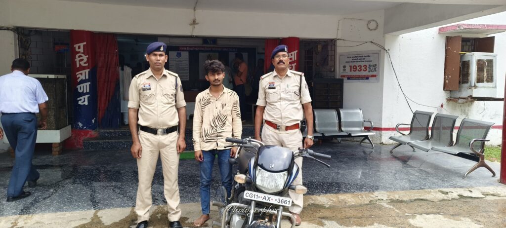 को शिवरीनारायण से पकडा गया जिसे अभिरक्षा में लेकर घटना के संबंध में पुछताछ किया गया जो जुर्म करना स्वीकार किया एवं चोरी किए मोटर सायकल बरामद किया गया।