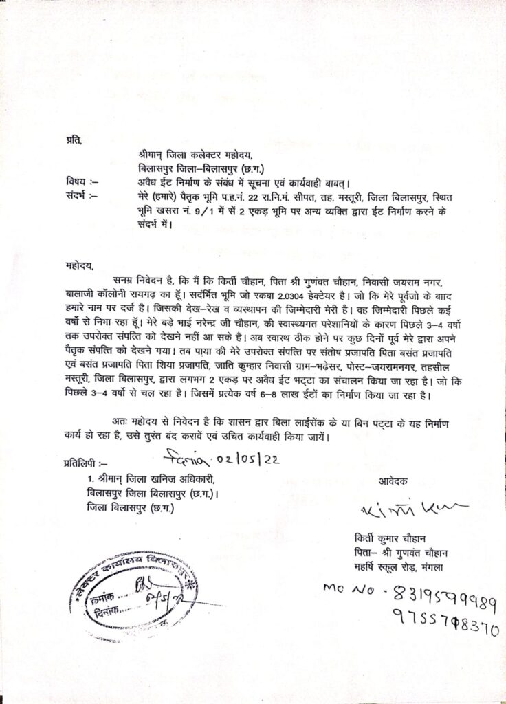 बिलासपुर। जमीन पर बेजा कब्जा करके अवैध तरीके से किये जा रहे निर्माण को तत्काल रोकने के निर्देश अतिरिक्त तहसीलदार ने दिये है।इसके बाद भी अवैध तरीके से जयरामनगर स्थित भनेसर की जमीन पर निर्माण कार्य किया जा रहा है।जिसकी शिकायत पीड़ित ने फिर से की हैं।यहाँ तक सरकारी जमीन पर ईंट भट्ठा भी बनाकर अवैध कारोबार किया जा रहा है।