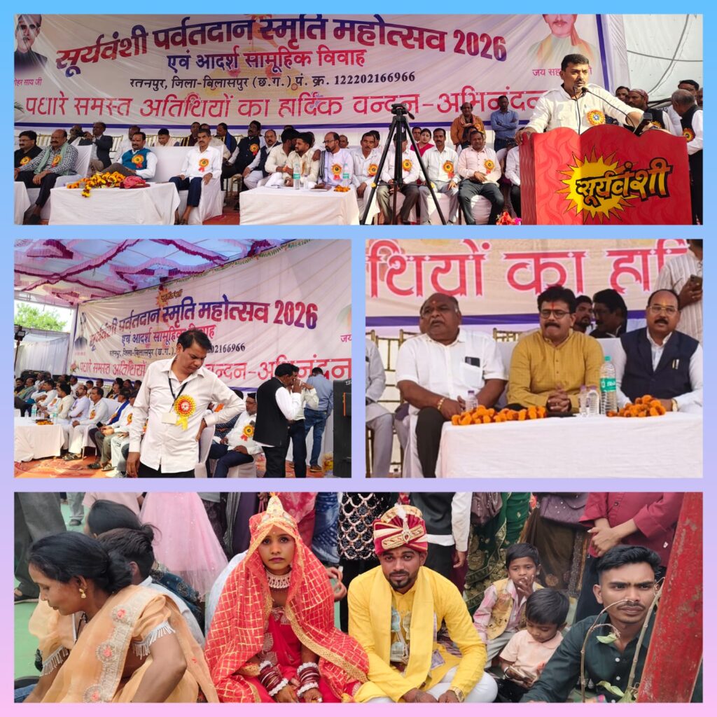 रतनपुर, सूर्यवंशी समाज के पूर्वज पुरोधाओं ने 100 साल पहले रतनपुर में पर्वत दान कर सूर्यवंशी समाज को एक दशा और दिशा देने का काम किए थे उन्हीं के परंपरा का निर्वहन करते हुए आज सूर्यवंशी समाज के द्वारा रतनपुर में आयोजित सूर्यवंशी पर्वत दान स्मृति महोत्सव के दूसरे दिन आज यानी 22 मार्च को सूर्यवंशी समाज के द्वारा एक भव्य आदर्श सामूहिक विवाह समारोह का आयोजन किया गया