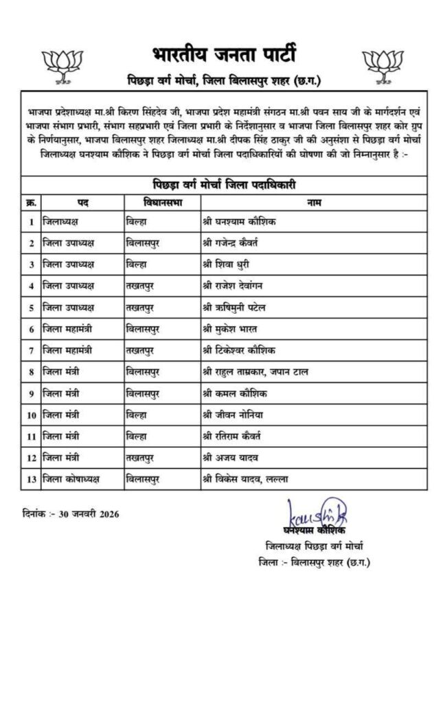 बिलासपुर।भाजपा प्रदेशाध्यक्ष किरण सिंहदेव, भाजपा प्रदेश महामंत्री संगठन पवन साय के मार्गदर्शन एवं भाजपा संभाग प्रभारी, संभाग सहप्रभारी एवं जिला प्रभारी के निर्देशानुसार व भाजपा जिला बिलासपुर शहर कोर ग्रुप के निर्णयानुसार, भाजपा बिलासपुर शहर जिलाध्यक्ष दीपक सिंह ठाकुर की अनुसंशा से पिछड़ा वर्ग मोर्चा जिलाध्यक्ष घनश्याम कौशिक ने पिछड़ा वर्ग मोर्चा जिला पदाधिकारियों की घोषणा की जो निम्नानुसार है ।