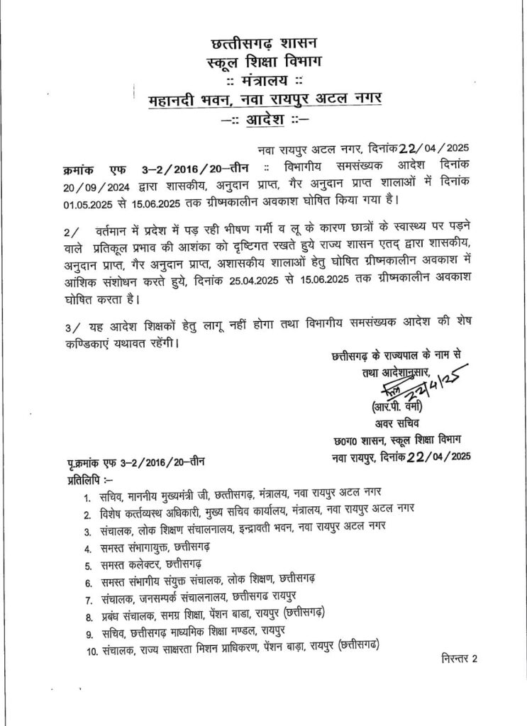स्कूल शिक्षा विभाग द्वारा जारी आदेश के अनुसार प्रदेश में पड़ रहे भीषण गर्मी लू के थपेड़ों को देखते हुए राज्य शासन द्वारा शासकीय अनुदान प्राप्त,गैर अनुदान प्राप्त शालाओं,प्राइवेट स्कूलों में अब ग्रीष्मकालीन अवकाश को संशोधित करते हुए 25 अप्रैल से 15 जून तक कर दिया गया है।