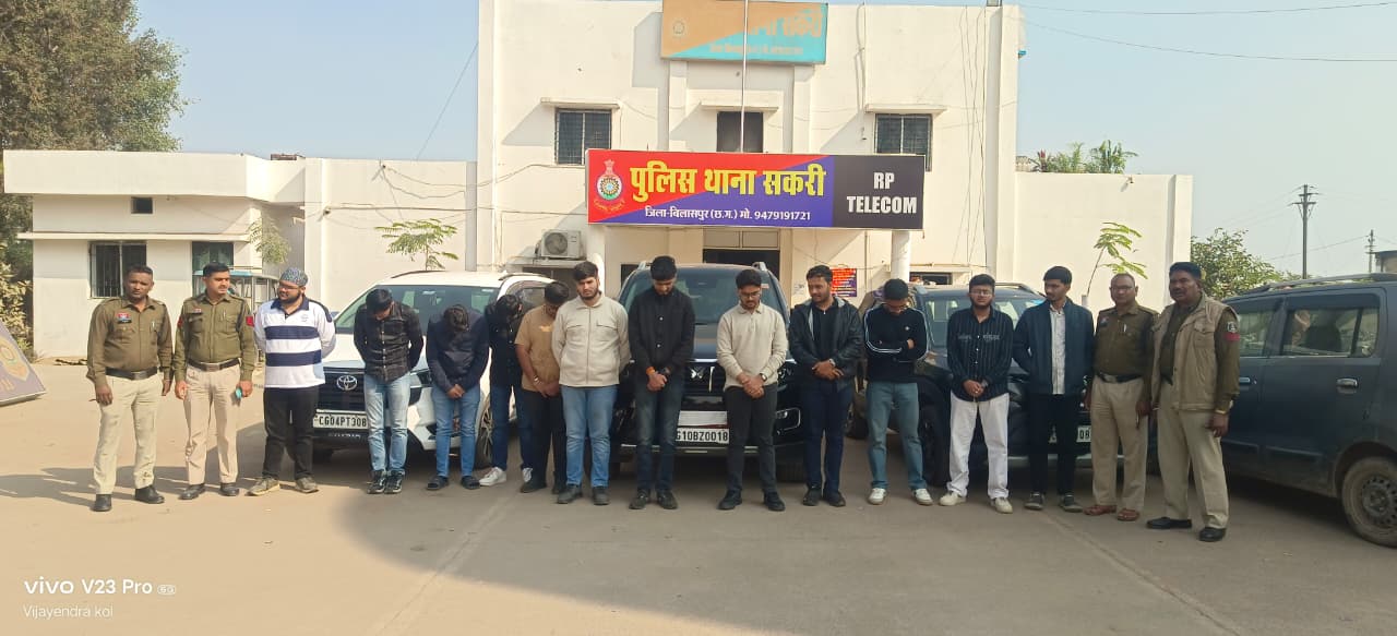 सकरी थाना क्षेत्र में बीती रात 12:30 बजे थाना प्रभारी विजय चौधरी पेट्रोलिंग पर निकले थे। पेट्रोलिंग करते हुए वह सकरी– पेंड्राडीह बायपास रोड स्थित सकरी ओवरब्रिज पहुंचे। सकरी ओवरब्रिज के पास जब पुलिस टीम पहुंची तो वहां तीन कारें—CG10BZ0018, CG10BQ8163, CG04PT3087—सड़क पर आवागमन बाधित करते हुए खड़ी थी। जिससे आवागमन बाधित हो रहा था। कार के ऊपर केक रखकर कुछ युवक जन्मदिन मना रहे थे और केक काट रहे थे। पूछताछ करने पर उनके नाम 1 सूजल देवांगन, 2 सागर मनचंद, 3 राजवीर हुरा, 4 प्रिंस गागवानी, 5 साहिल सचदेव, 6 उत्कर्ष खरे, 7 मुस्तफा लक्ष्मीधर, 8 पियुष जायसवाल, 9 पियुष शिवहरे, 10 रोशन मंगलानी, 11 पल आहुजा, 12 शुभम साहू होना बताया।