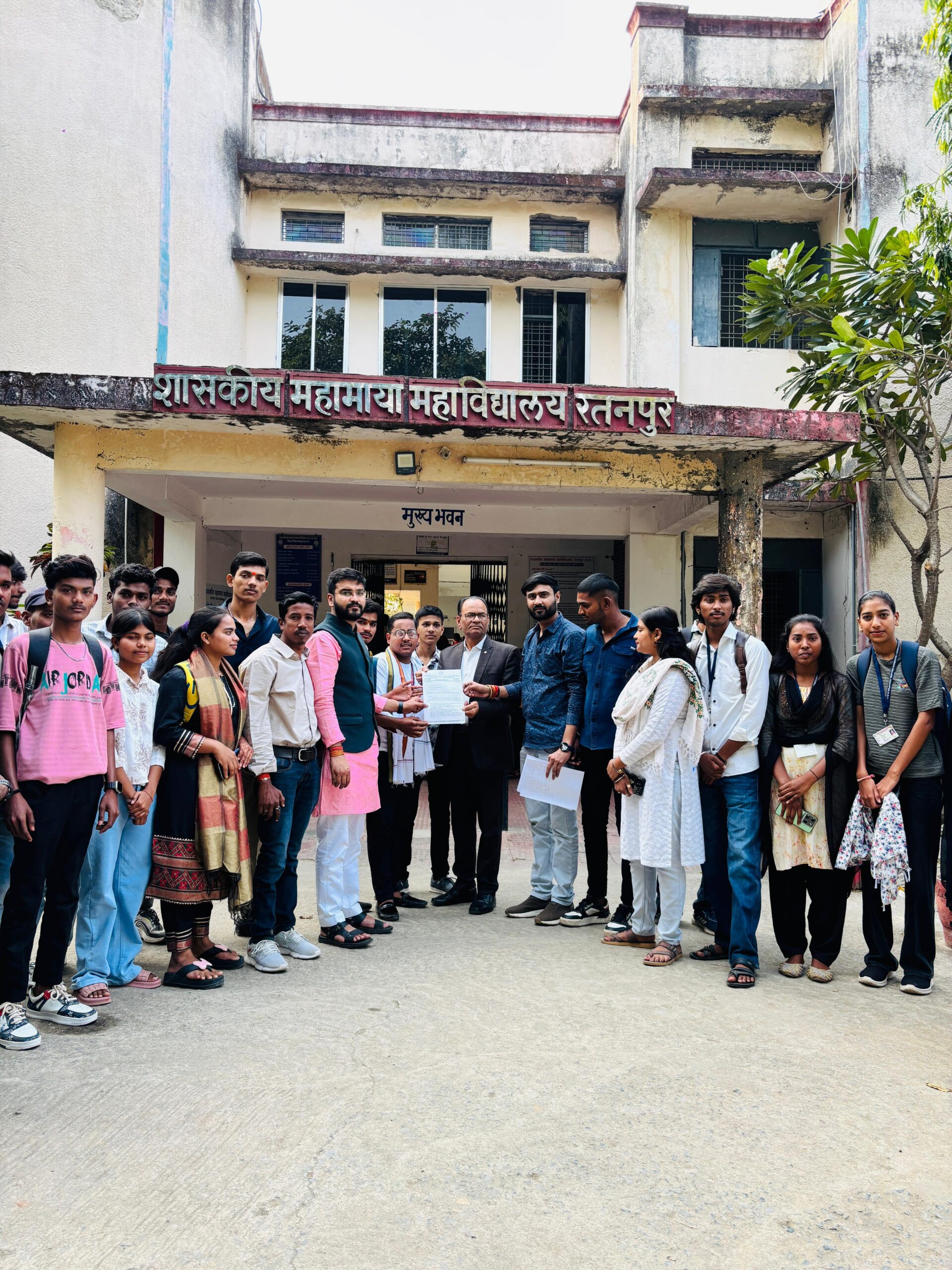 रतनपुर : एनएसयूआई के प्रदेश उपाध्यक्ष शशांक (लक्की) मिश्रा एवं प्रदेश सचिव राजा रावत के नेतृत्व में रतनपुर स्थित महामाया कॉलेज के लाचार व्यवस्था से परेशान छात्रों के हितों को देखते हुए आज 10 सुत्रीय प्रमुख मांगो को लेकर रतनपुर एनएसयूआई के छात्र नेता मानस ताम्रकार,आदित्य साहू,माही राजपूत सहित सैकड़ो महाविद्यालय में अध्ययनरत छात्रों के साथ प्राचार्य को ज्ञापन सौंपा, विदित हो कि शासकीय महामाया महाविद्यालय रतनपुर आसपास छेत्र का बड़ा महाविद्यालय है जिसमे दूर दूर से छात्र-छात्राए अध्ययन हेतु आते है जिन्हे कई सारी समस्याओं का सामना करना पड़ता है जिसके निराकरण हेतु आज ज्ञापन सौपा गया, जिसमे प्रमुख मांगे –
