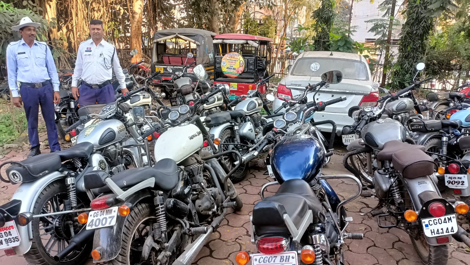 रायपुर। पुलिस उप महानिरीक्षक एवं वरिष्ठ पुलिस अधीक्षक डॉ. लाल उमेद सिंह के निर्देशानुसार दोपहिया वाहन में तेज आवाज करने वाले मोडिफाई सायलेंस लगाकर चलने वाले बुलेट वाहन चालकों के विरूद्ध विशेष अभियान चलाकर मोटरयान अधिनियम के तहत सख्त कार्यवाही करने के निर्देश पर यातायात पुलिस के अधिकारी/कर्मचारियों द्वारा शहर के प्रमुख मार्गो में चेकिंग पाइंट लगाकर विशेष अभियान चलाते हुए मोडिफाई सायलेंसर लगे 35 बुलेट वाहनों को पकड़कर जप्ती किया गया एवं मोटरयान अधिनियम के तहत 5000-5000 हजार रूपये फाईन कांटकर मोडिफाई सायलेंसर जप्त किया गया।