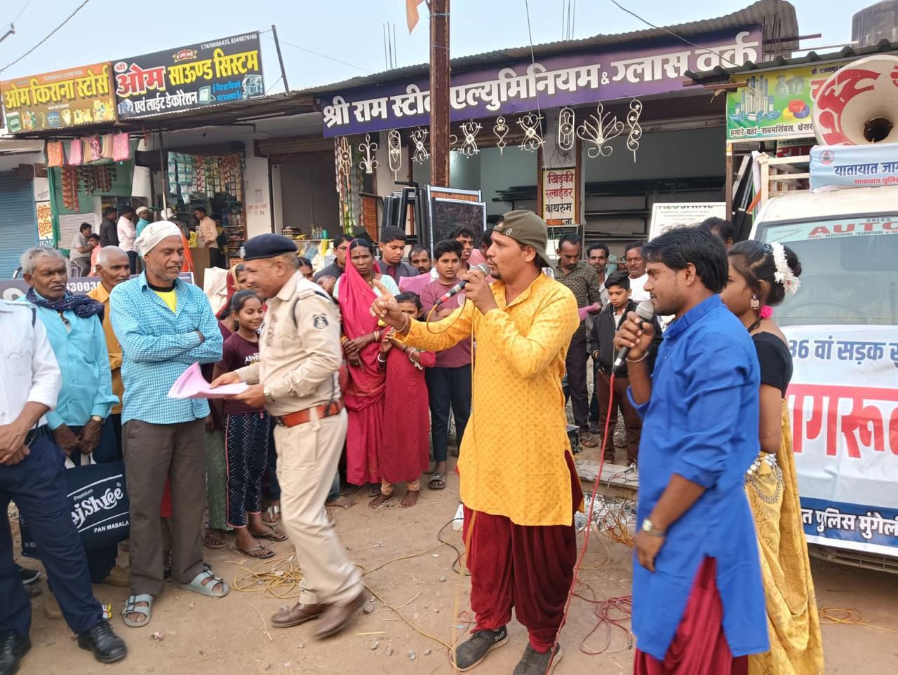 बिलासपुर/मुंगेली। 36वां राष्ट्रीय सड़क सुरक्षा माह2025 के तहत जन जन मे यातायात नियमों के प्रति जागरूकता लाने के लिये जारहागांव के साप्ताहिक बाजार मे नुककड़ नाटक के माध्यम से लोगोँ के बीच जाकर यातयात नियमों का पालन ना करने पर उसके नुकसान के बारे मे बताया गया साथ ही सड़क पर चलाते समय या वाहन चलाते समय हमेशा यातायात नियमों का पालन करने को प्रेरित किया गया सड़क सुरक्षा जीवन रक्षा. के थीम पर आधारित नाटक के माध्यम से कलाकारों ने सड़क पर नियमों का पालन ना करने पर क्या क्या नुकसान हो सकता है को नाट्य रूपनांतरण कर बताया कि ज़ब भी दुपहिया वाहन चालये हेलमेट लगाएं, नशे मे वाहन ना चलाये ,वाहन के कागजात हमेशा साथ रखें , नाबालिक को वाहन चलाने ना दें, उक्त कार्यक्रम मे यातायात प्रभारी एसआईअमित गुप्ता, एएसआई यशवंत राजपूत , सीताराम बर्मन, रोशन साहू उपस्थित रहे