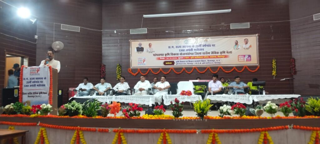 कार्यक्रम के मुख्य अतिथि राजेश सुर्यवशीं, अध्यक्ष जिला पंचायत बिलासपुर द्वारा बताया गया कि 01 नवम्बर 2000 को छ.ग. राज्य की स्थापना से लेकर अब तक किसान हितैसी राज्य सरकार द्वारा किसानों के विकास के लिए अनेक योजनाएं संचालित की जा रही है। इन 25 वर्षों में जिले के किसानों द्वारा कृषि क्षेत्रों में अनेक नवीन तकनीकों और वैज्ञानिक सोंच को अपनाया है, जिसे आज रजत जयंती महोत्सव कार्यक्रम के माध्यम से प्रदर्शित किया जा रहा है। साथ ही इस कार्यक्रम में कृषि, उद्याानिकी, पशुपालन, मतस्य पालन, कृषि महाविद्यालय, कृषि विज्ञान केन्द्र, किसान बीज उत्पादक संस्था रिस्दा एवं महिला स्व सहायता समूहों द्वारा निर्मित कृषि तथा जैविक उत्पादों का प्रदर्शन तथा योजनाओं का प्रचार प्र्रसार किसानों के मध्य किया जा रहा है। कार्यक्रम की अध्यक्षता अनुसुईया जागेन्द्र कश्यप, सभापति कृषि स्थाई समिति द्वारा किया गया।
