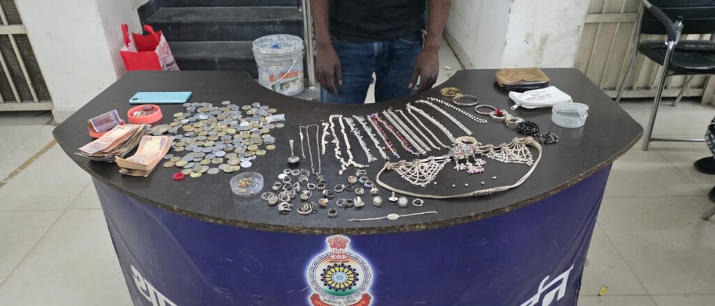 तलाशी लेने पर उसके पास सोने-चांदी के जेवरात, नगदी नोट एवं सिक्के मिले। कड़ाई से पूछताछ करने पर उसने बताया कि उक्त सामान उसने देवेन्द्र नगर के एक सूने मकान में चोरी कर हासिल किया है। उसकी निशानदेही पर पुलिस टीम देवेन्द्र नगर पहुँचकर मकान मालिक चंद्रभान सिंह ठाकुर से संपर्क कर जाँच कराई, जिन्होंने अपने घर में चोरी होना पुष्टि की।मकान मालिक की पुष्टि तथा आरोपी के बयान पर अपराध दर्ज कर ₹1,25,000/- का पूरा चोरी गया सामान बरामद किया गया। आरोपी को गिरफ्तार कर न्यायिक रिमांड पर प्रस्तुत किया जा रहा है।
