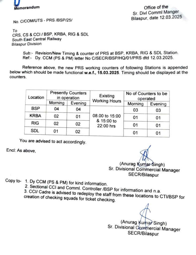 बिलासपुर।दक्षिण पूर्व मध्य रेलवे बिलासपुर जोन के अंतर्गत बिलासपुर डिवीजन स्टेशन कोरबा, रायगढ़ शहडोल , अन्य स्थानों पर आरक्षित टिकट काउंटर की वर्तमान संख्या बढ़ाने की बजाय जो काउंटर संचालित है , उनकी संख्या अधिकारी द्वारा फरमान जारी कर घटा दी गई है ,अपितु घटाए गए काउंटर में केवल एक कैश काउंटर बाकी अन्य काउंटर ऑनलाइन पेमेंट,साथ ही जो सीनियर सिटीजन विकलांग काउंटर रहते है,वह भी समाप्त कर दिया गया है। आखिर यह आदेश रेल विभाग सीसीएम कार्यालय के द्वारा बिलासपुर अंचल में 15 मार्च से लागू भी कर दिया गया अन्य स्टेशनों में भी यही स्थिति कायम हो गई है।