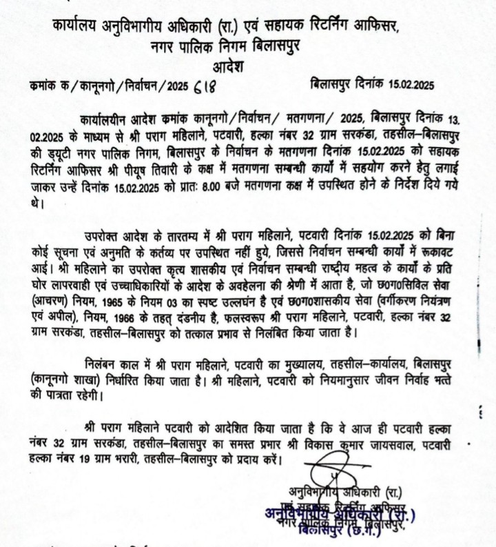 KKC ब्रेकिंग बिलासपुर। एसडीएम पीयूष तिवारी ने लापरवाही बरतने वाले पटवारी को निलंबित कर दिया है।पटवारी को मतगणना स्थल में पहुंचने और सहयोग करने के लिए ड्यूटी लगाई गई थी।लेकिन कार्य में लापरवाही बरतते हुए पटवारी ड्यूटी से ही गायब रहे।