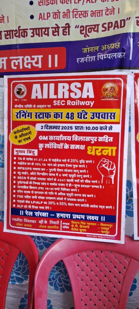 बिलासपुर । रनिंग स्टाफ यानी लोको पायलट और गार्ड ने अपने कई पुराने मांगों को लेकर 48 घंटे के उपवास का निर्णय लिया है। एआईएलआर एसए के आह्वान पर मंगलवार से जीएम कार्यालय सहित सभी क्रू लॉबियों के सामने धरना शुरू हो गया है। स्टाफ का कहना है कि वे दिन-रात ट्रेनें चलाकर देश की अर्थव्यवस्था को आगे बढ़ाते हैं, लेकिन उनके अधिकारों और सुविधाओं की लगातार अनदेखी की जा रही है।
