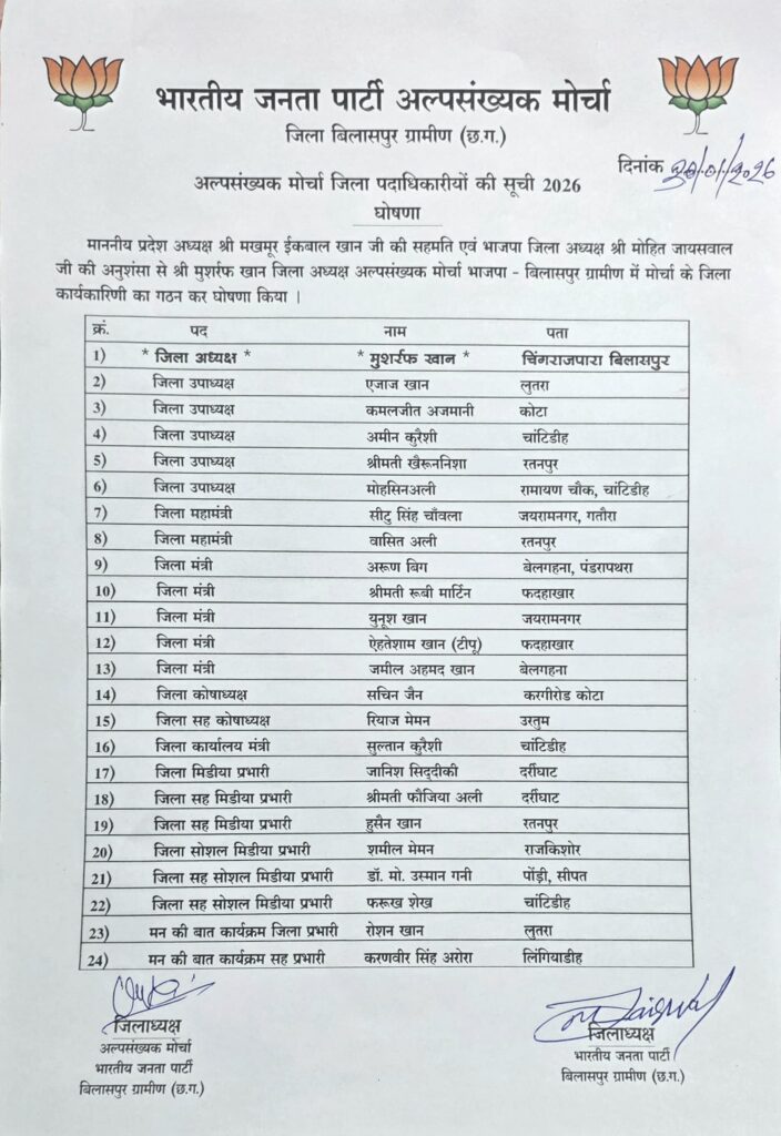 बिलासपुर।भाजपा प्रदेशाध्यक्ष किरण सिंहदेव , भाजपा प्रदेश महामंत्री संगठन पवन साय के मार्गदर्शन एवं भाजपा संभाग प्रभारी, संभाग सहप्रभारी एवं जिला प्रभारी के निर्देशानुसार व भाजपा जिला बिलासपुर शहर कोर ग्रुप के निर्णयानुसार, भाजपा बिलासपुर शहर जिलाध्यक्ष दीपक सिंह ठाकुर की अनुसंशा से अल्पसंख्यक मोर्चा जिलाध्यक्ष मो.हनीफ ने अल्पसंख्यक मोर्चा जिला पदाधिकारियों की घोषणा की जो निम्नानुसार है ।