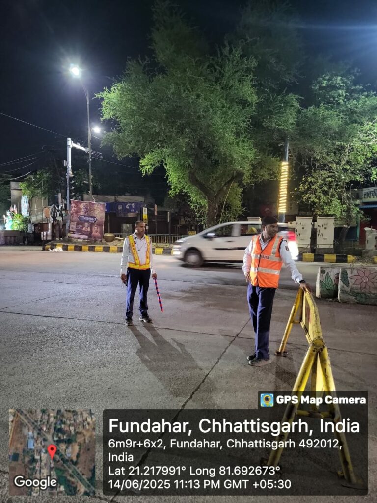 कार्यवाही के अनुक्रम में इस शनिवार एवं रविवार को अतिरिक्त पुलिस अधीक्षक यातायात रायपुर डॉ प्रशांत शुक्ला के मार्गदर्शन में रायपुर पुलिस द्वारा शहर के श्रीराम मंदिर के पास, फुण्डहर चौक एवं शंकर नगर एक्सप्रेस वे ब्रिज चौक में यातायात पुलिस तैनात कर रात्रि 11 बजे से 02 बजे तक बेरिकेटिंग कर चेकिंग अभियान चलाया गया जिसमें 11 ड्रंक एंड ड्राइव वाहन चालकों के विरूद्ध मोटरयान अधिनियम की धारा 185 के तहत कार्यवाही की गई, प्रकरण निराकरण के लिए कोर्ट भेजा गया। सभी वाहन चालको का लाइसेंस भी निलंबन हेतु परिवहन कार्यालय भेजा जायेगा!