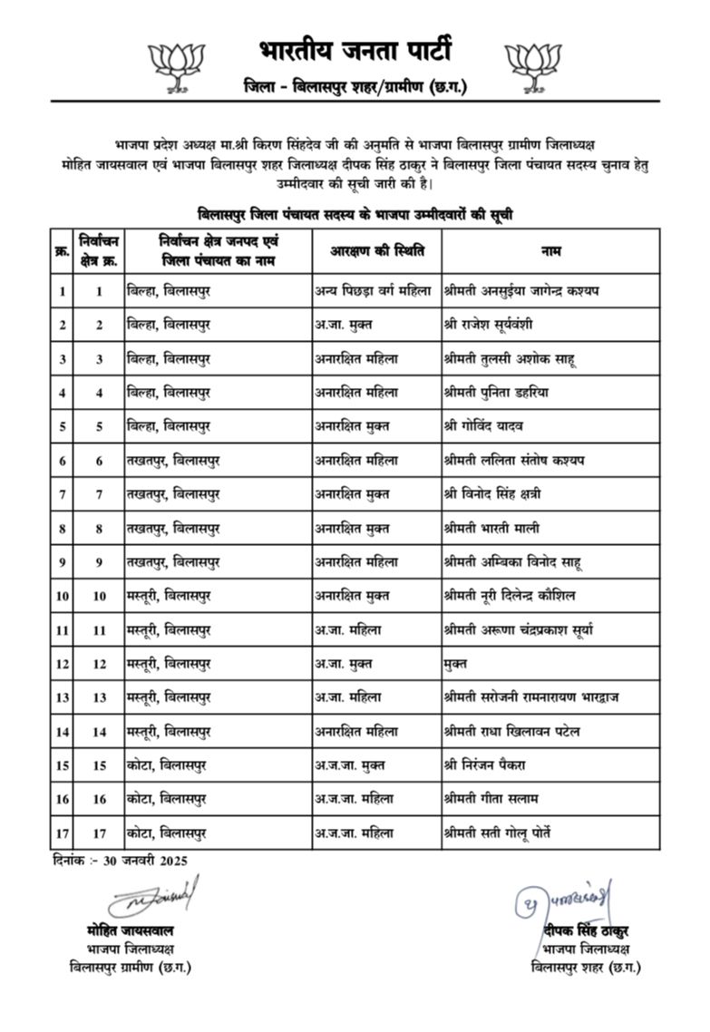भाजपा प्रदेश अध्यक्ष मा.श्री किरण सिंहदेव की अनुमति से भाजपा बिलासपुर ग्रामीण जिलाध्यक्ष मोहित जायसवाल एवं भाजपा बिलासपुर शहर जिलाध्यक्ष दीपक सिंह ठाकुर ने बिलासपुर जिला पंचायत सदस्य चुनाव हेतु उम्मीदवार की सूची जारी की है।