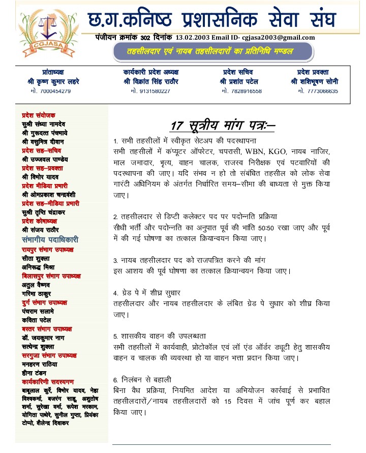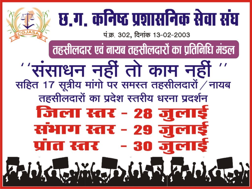 बिलासपुर। छत्तीसगढ़ कनिष्ठ प्रशासनिक सेवा संघ के बैनर तले प्रदेश के समस्त तहसीलदार एवं नायब तहसीलदार संसाधन नहीं तो काम नहीं” के नारे के साथ अपनी 17 सूत्रीय मांगों को लेकर चरणबद्ध आंदोलन के तहत धरना-प्रदर्शन कर रहे हैं।यह प्रदर्शन शासन के लंबे समय से लंबित कार्यक्षमता से जुड़ी समस्याओं, संसाधनों की कमी, पदोन्नति एवं संरचनात्मक सुधार की मांगों की अनदेखी के विरोध में किया जा रहा है। संघ के प्रतिनिधि मंडल ने लिए गए निर्णयानुसार यह प्रदर्शन निम्नानुसार किया जाएगा:
