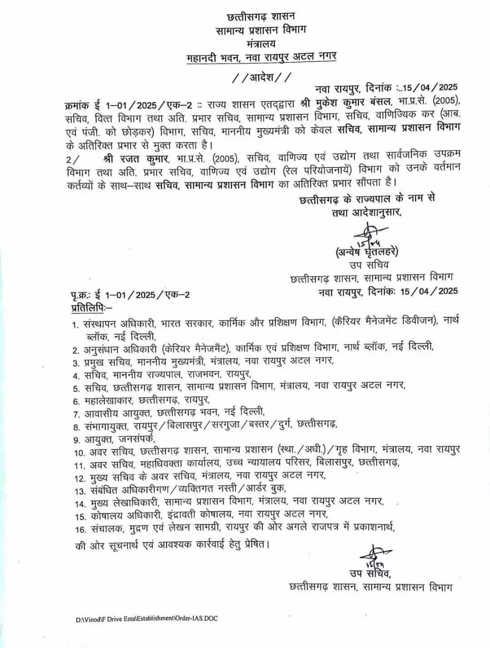 रायपुर। छत्तीसगढ़ की ब्यूरोक्रेसी में एक बार फिर बड़ी हलचल देखने को मिली है। नवा रायपुर से निकले एक आदेश ने प्रशासनिक गलियारों में चर्चाओं का दौर तेज कर दिया है। वित्त सचिव मुकेश कुमार बंसल से सामान्य प्रशासन विभाग का प्रभार छीन लिया गया है – एक ऐसा विभाग जो नीतिगत फैसलों और पावर पॉलिटिक्स का केंद्र माना जाता है।