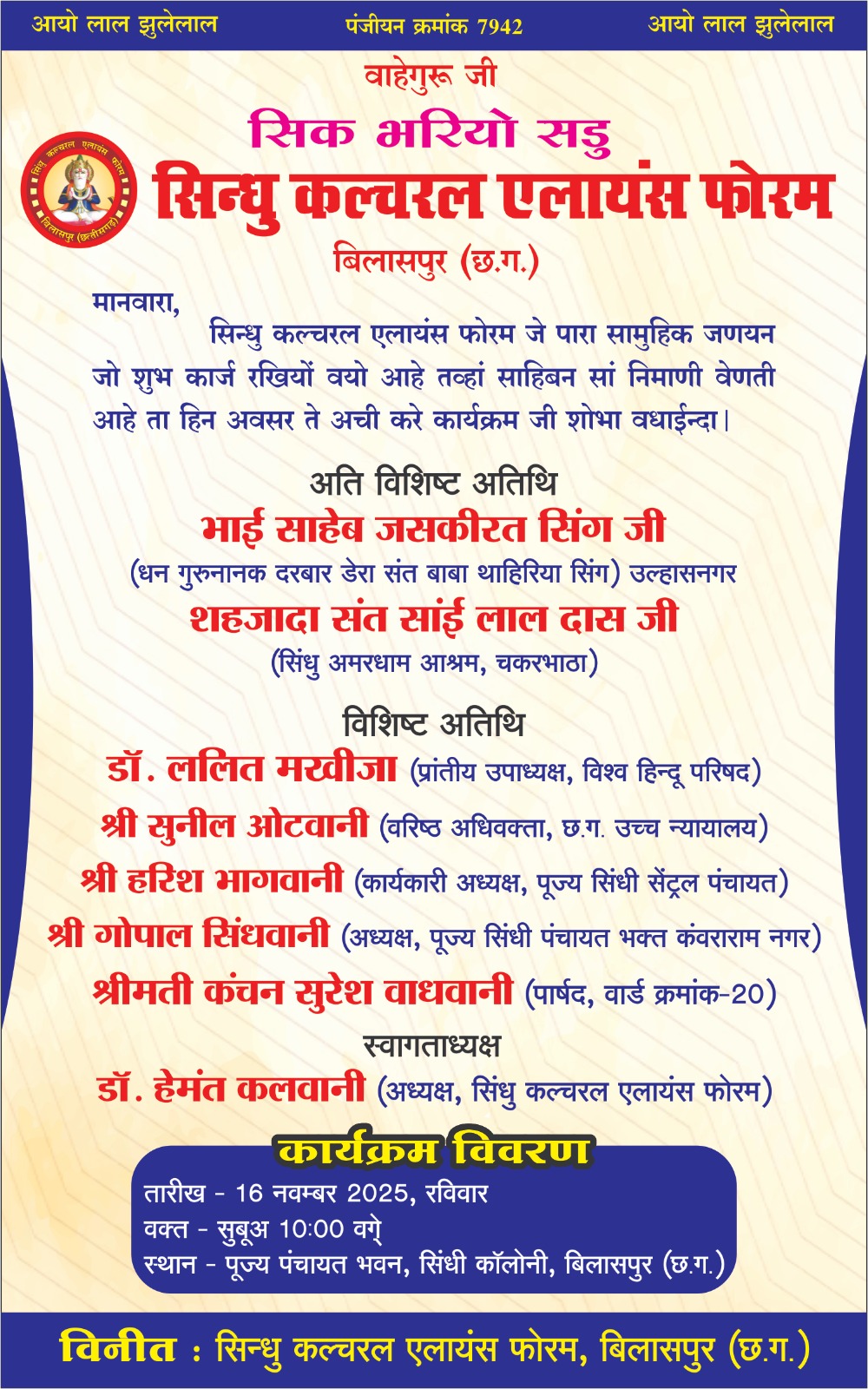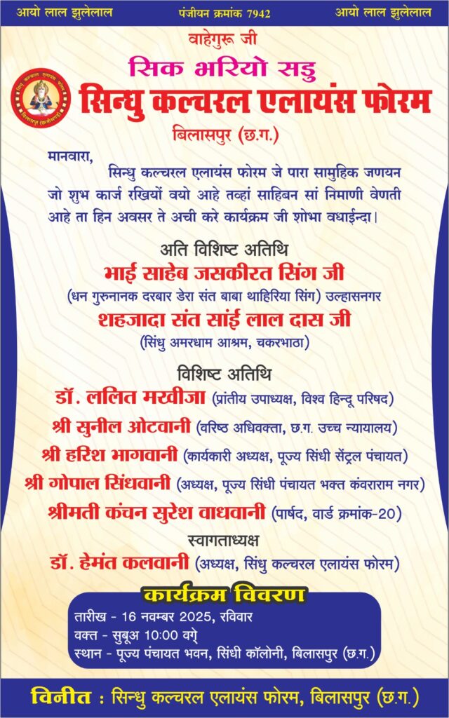 नगर की सामाजिक संस्था सिंधु कल्चरल एलायंस फोरम दवारा 16 नवंबर को होने वाले सामूहिक जनेऊ संस्कार के संदर्भ संस्था के अध्यक्ष डॉ. हेमंत कलवानी ने जानकारी देते हुए बताया कि उक्त कार्यक्रम अति विशिष्ट अतिथि के रूप में सिंधु अमर धाम आश्रम चकरभाठा के संत सांई लाल दास जी के सानिध्य में होने जा रहा है