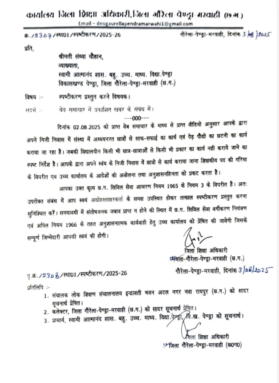 स्वामी आत्मानंद स्कूल की महिला व्याख्याता ने स्कूल के छात्रों से अपने घर की साफ सफाई करवाई और पेड़– पौधों की छटनी करवाई। इसका वीडियो वायरल होने पर महिला व्याख्याता को नोटिस जारी किया गया है।
