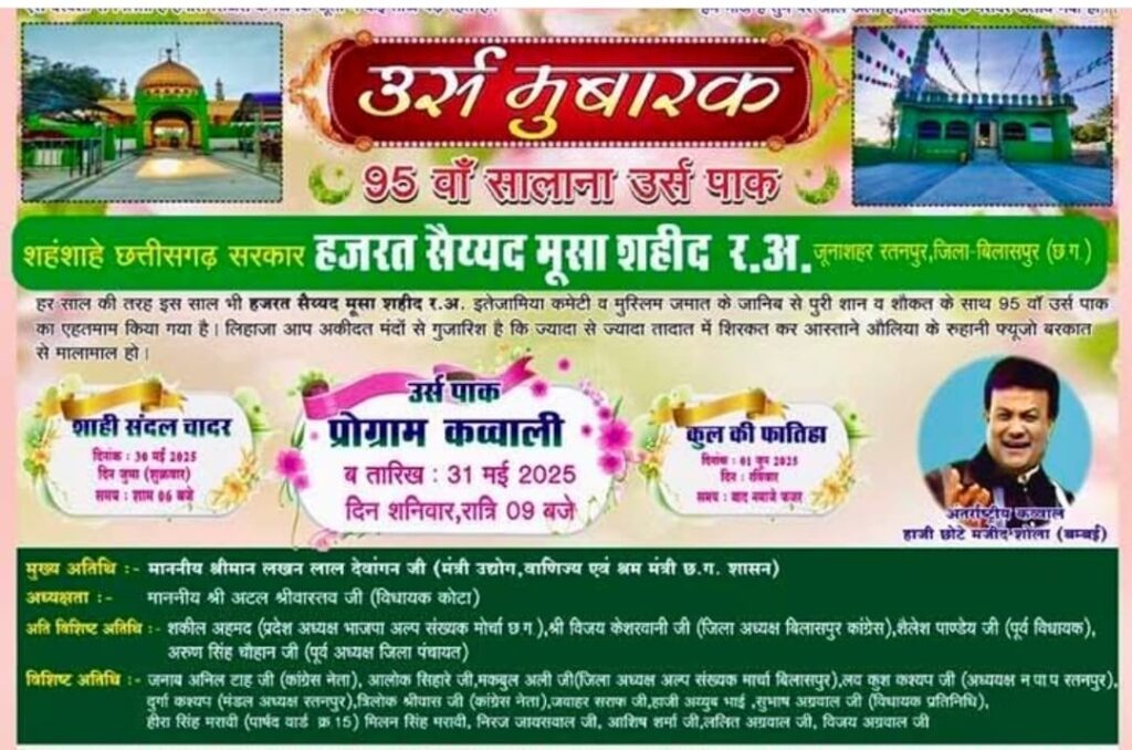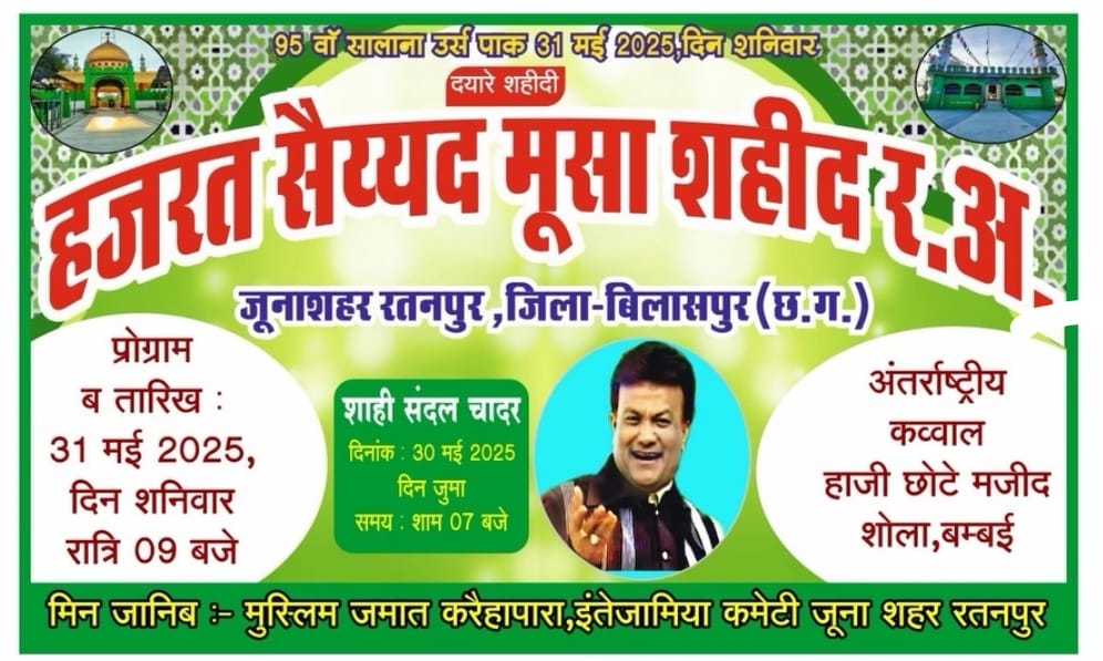 रतनपुर…. हर साल की तरह इस साल भी बड़े ही सानो शौकत के साथ हजरत सैय्यद मूसा शहिद रहमतुल्लाह अलैका का 95 सालाना उर्स पाक 31 मई दिन शनिवार को मनाया जाएगा