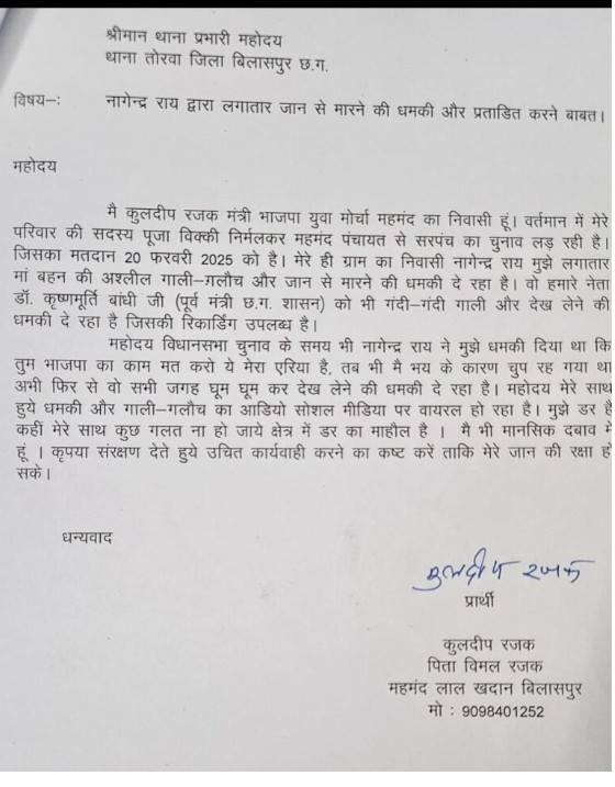 और गुंडागर्दी का दौर शुरू हो गया है। मस्तूरी कांग्रेस के ब्लाक अध्यक्ष नागेंद्र राय ने भाजयुमो नेता कुलदीप रजक को फोन करके धमकाने और पूर्व MLA को गंदी-गंदी गालियां देने का ऑडियो जमकर वायरल हो रहा है।